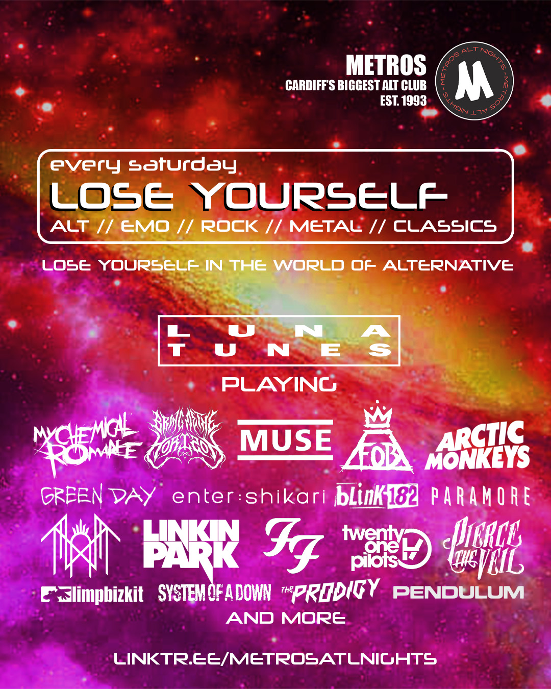 My Chemical Romance // Bring Me The Horizon // Panic! At The Disco // Fall Out Boy // Slipknot // Enter Shikari // System of A Down // Sleep Token // Rage Against The Machine // Twenty One Pilots // Paramore // Bad Omens // Electric Callboy // Linkin Park // Sum 41 // Poppy // Eminem // Gorillaz // Modern Baseball // Foo Fighters // Muse // Green Day // Blink 182 // Basement AND SO MUCH MORE!