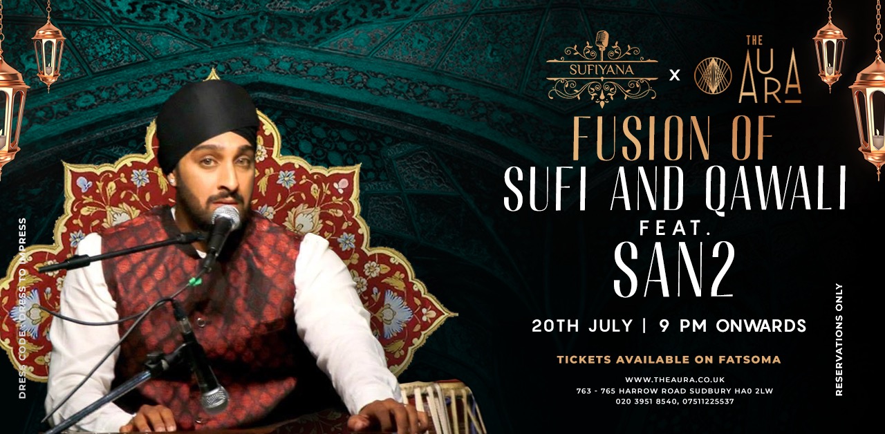 Join us for the best Qawali and Sufi night at The Aura Wembley ft. SAN2, on Thursday 13th July! Get your tickets fast as this event will sell out!