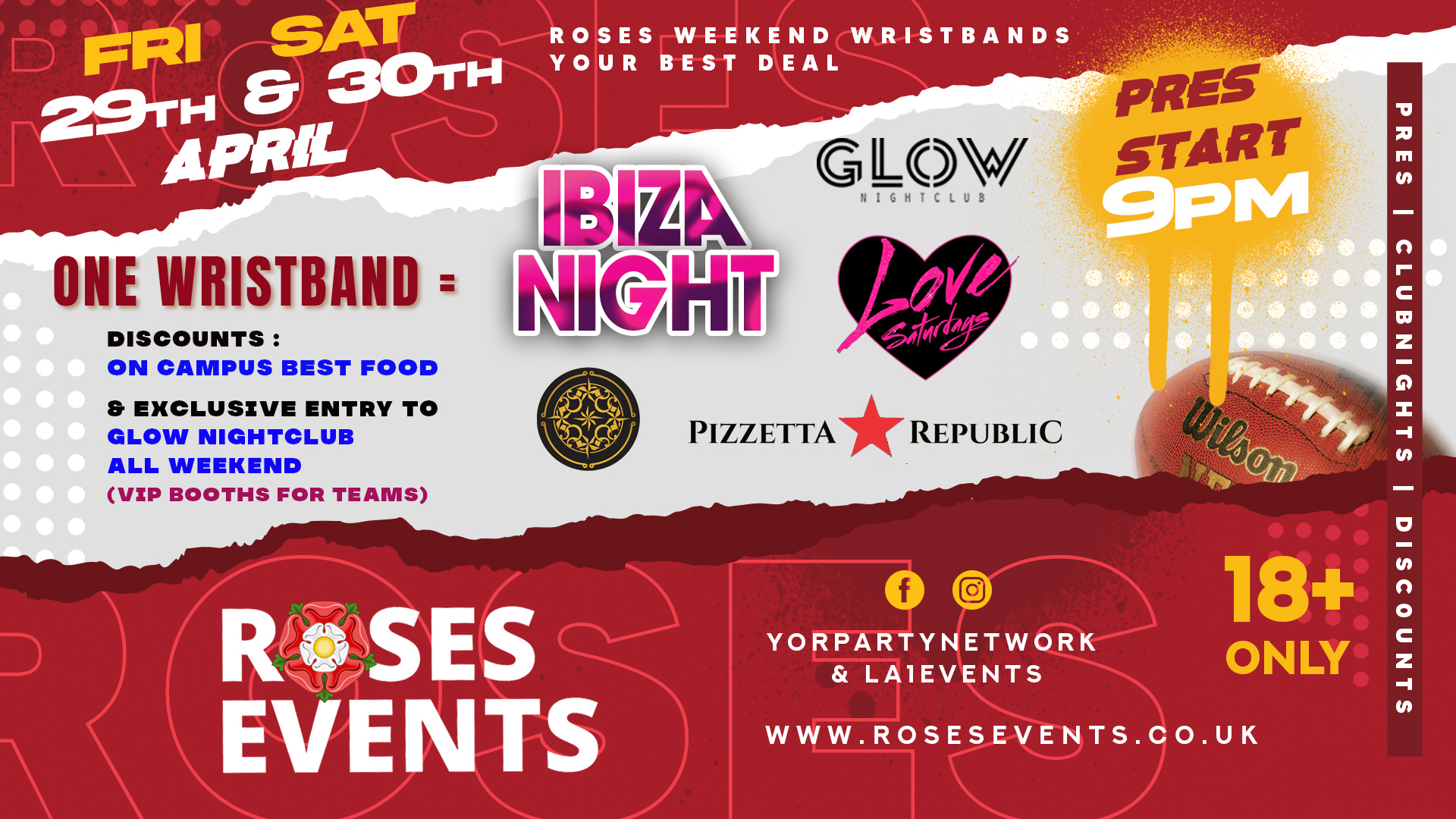 Collect your wristbands either on entry to one of Glow nightclub's weekend events, where you present your Fatsoma barcode, or from us if you contact us through our Instagram @officialroses events, or if you purchase a wristband in person at full price. These wristbands will serve as proof of purchase.