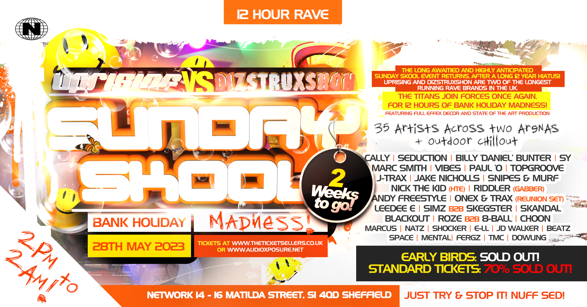 The long awaitied and highly anticipated Sunday Skool event returns, after a long 12 year hiatus! Uprising and Dizstruxshon are two of the longest running rave brands in the UK. The titans join forces once again, for 12 hours of Bank Holiday madness! Sunday Skool is in session. Just try & stop it - Nuff Sed!