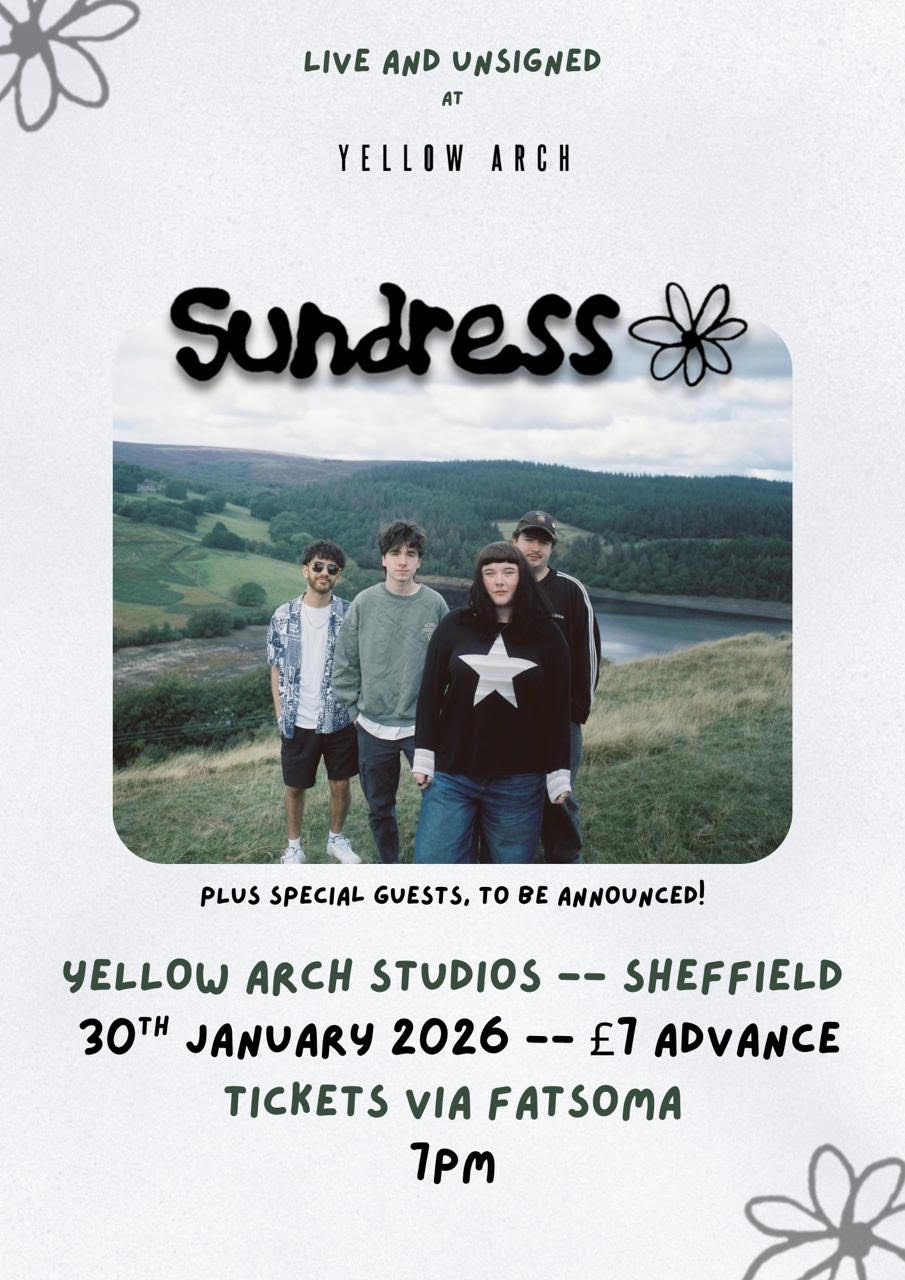 Sundress return to Sheffield for their first-ever headline show at Yellow Arch Studios, fresh from making their mainstage debut at this year’s Tramlines Festival. Blending nostalgic warmth with a shimmering, reminiscent sound, their music feels instantly familiar yet excitingly new — the kind you hear once and want to hear again. Join us for a night that marks a big moment in the band’s journey and a vibe you won’t want to miss.