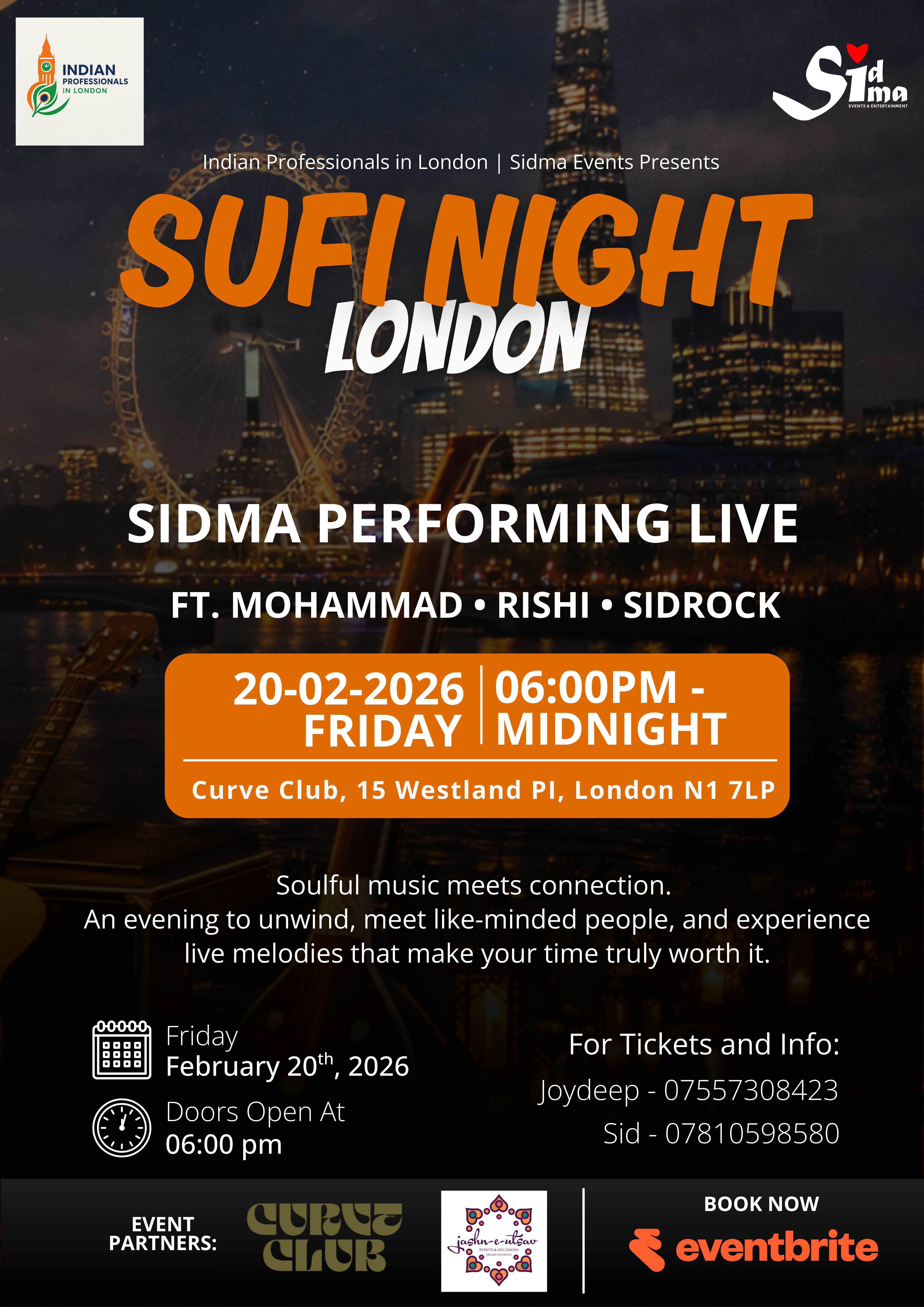 Join us for a soulful evening of SUFI night and Indian Professionals in London connections with an amazing live band - Sidma performing live