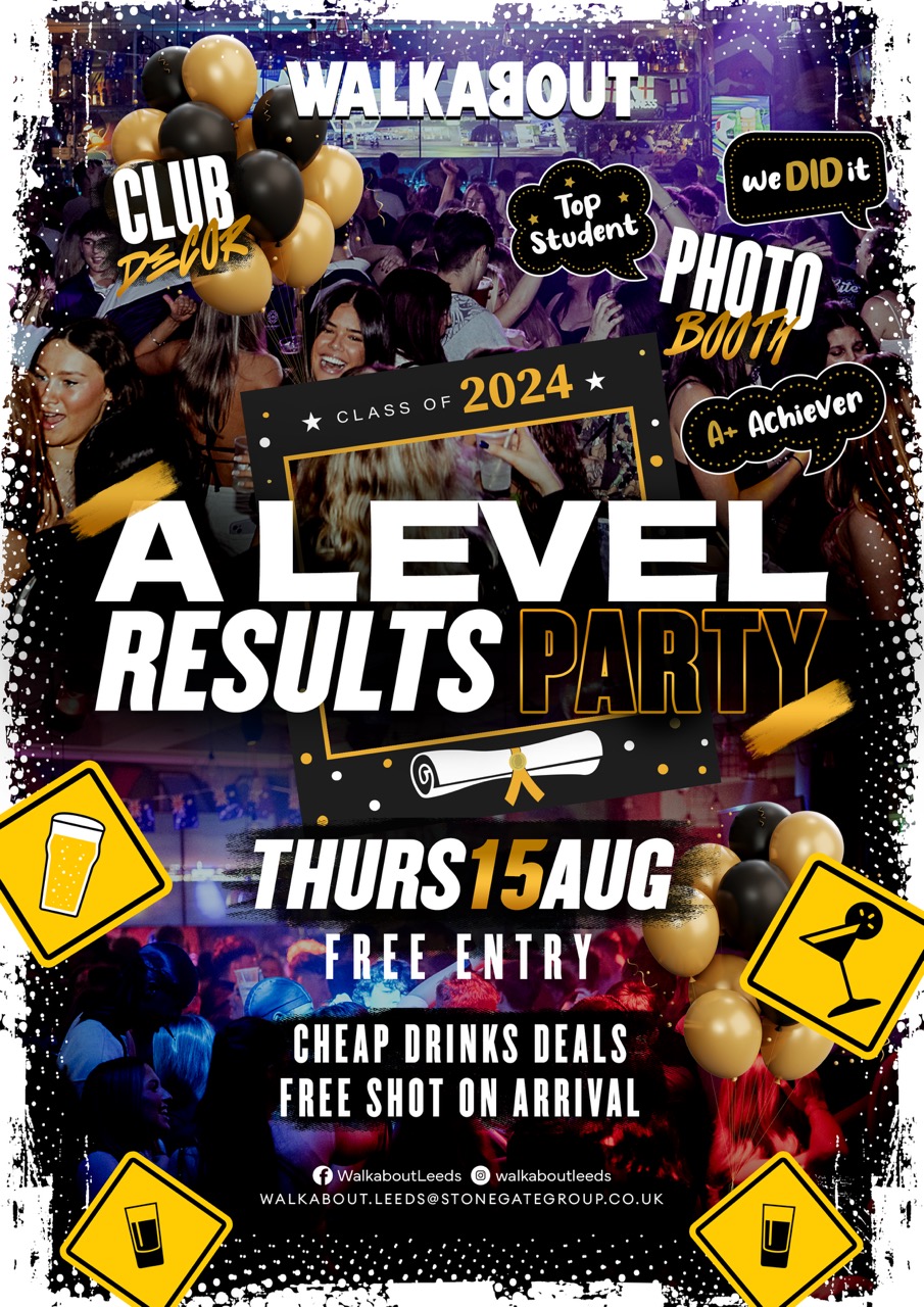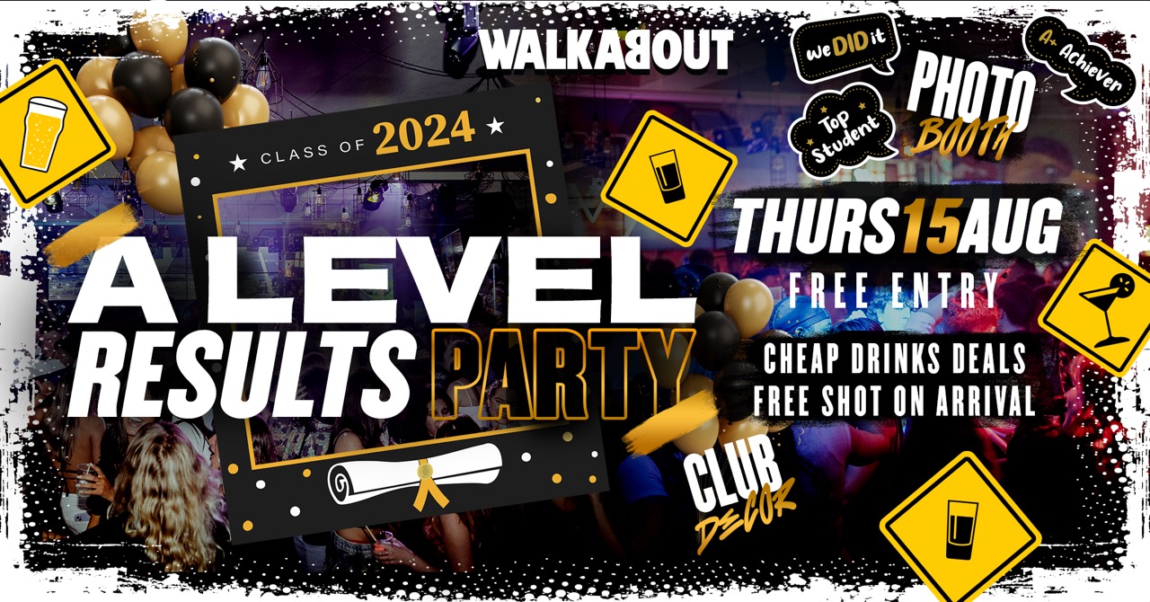 Celebrate your A Level Results at Walkabout Leeds on Woodhouse Lane! Join us for the ultimate A Level Results party with cheap drinks student deals all night long. Our DJ will be spinning party anthems to keep you dancing all night.