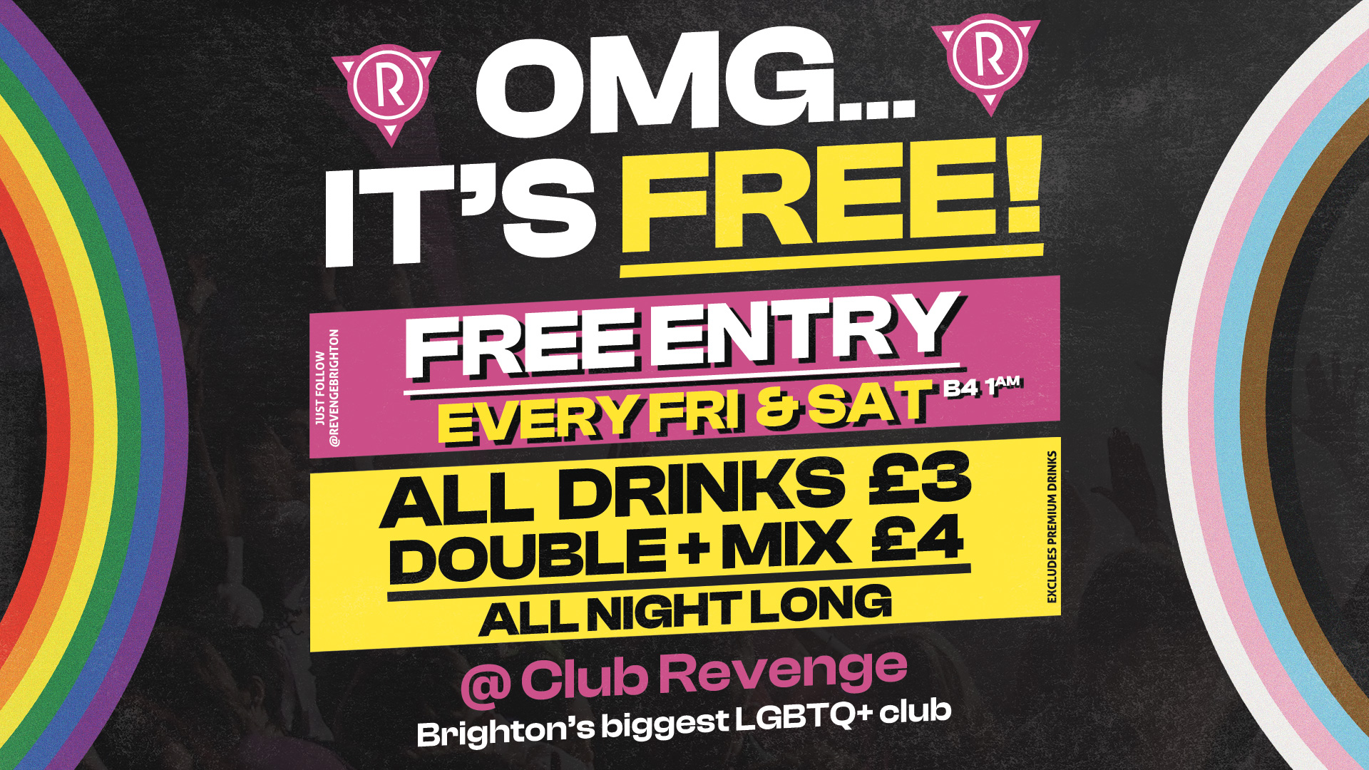 All you have to do is show us on the door that you’re following @revengebrighton on any social media platforms.