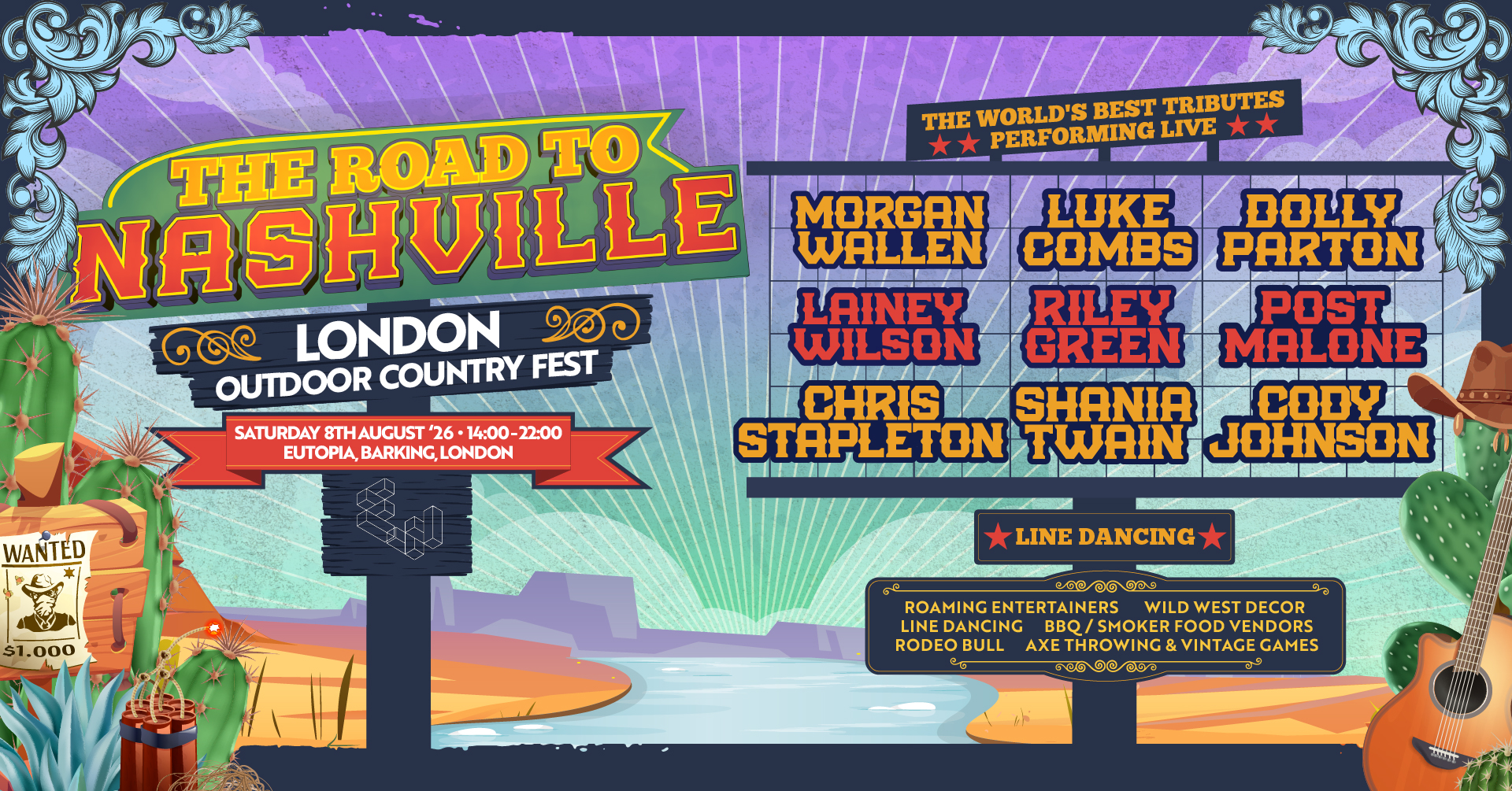 Join us on Saturday 8th August 2026 at Eutopia, Barking for a full-day country music takeover, packed with the world's best tribute acts performing live, celebrating the biggest names in country music - including Morgan Wallen, Luke Combs, Dolly Parton, Lainey Wilson, Post Malone, Riley Green, Chris Stapleton and Cody Johnson.