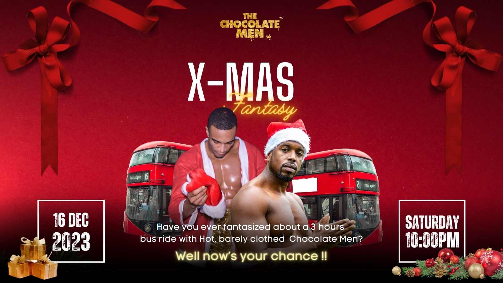 Come and party while our bus drives around London, that’s 3 hours of up close and personal time with The Chocolate Men. It’s the perfect way for the worshipers of Chocolate Men to celebrate any occasion!