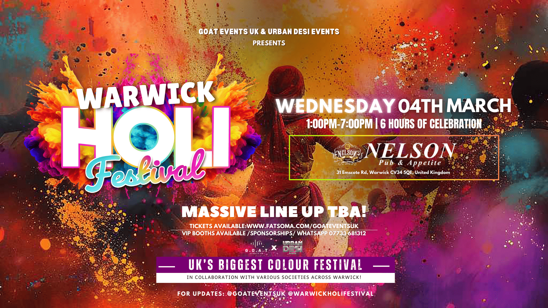 Organised by GOAT Events UK and Urban Desi Events in collaboration with Various societies, this iconic festival brings people together through music, food, dance, and the joy of Holi—all in one spectacular open-air celebration.