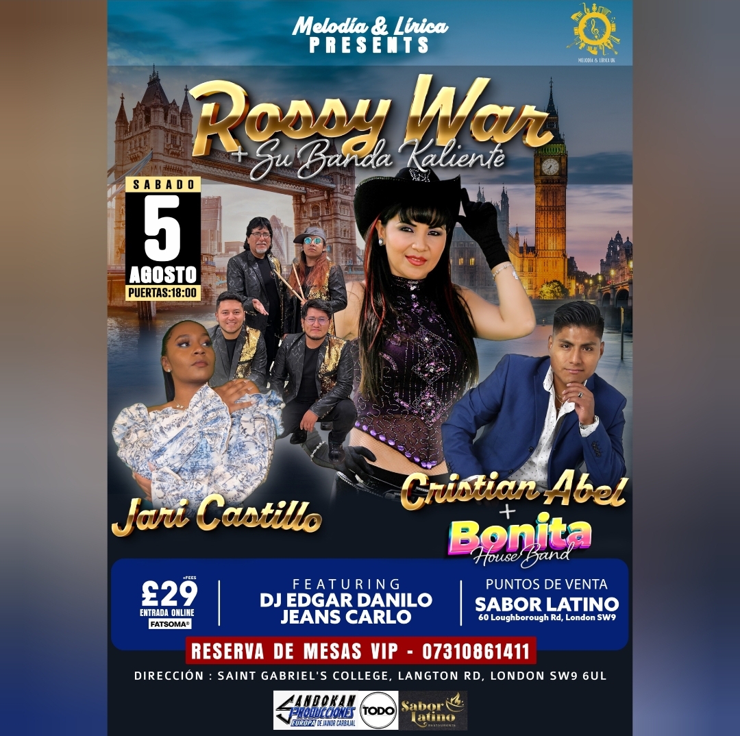 ROSSY WAR nos estará cantando sus mejores éxitos en un show exclusivo de 2h, canciones como "Nunca pensé llorar, Amor prohibido, Que te perdone Dios" y muchos éxitos más.