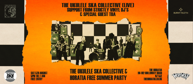 Wow April's party was a complete sellout so we look forward to the Summer edition of our wonderful joint free party at the Horatia with the amazing The Ukulele Ska Collective on Sat 5th August, this time we are going to make it a bit of afternoon to evening session, with DJs, Record stalls, Iconic films being show early evening, plus a special sizzling summer food/ drink combo offer, we do advise folks to get down early for this one and have a fantastic new menu from the kitchen.“We love ukuleles, and we love ska. So... we play ska music on the ukulele, with kazoos. Oh, and bass and drums... and melodica and accordion. Catchy, fun sing along, danceable ska tunes, from Prince Buster to the Specials and Toots and the Mayals. You’ll smile and dance, it’s contagious.” The Ukulele Ska CollectiveCatch the wonderful The Ukulele Ska Collective perform at the Highbury and Islington’s Horatia with the wonderful Itchysoul on Dj support from the Horatia Strictly Vinyl crew & special guest TBA The Ukulele Ska Collective are going to do two fun packed jams through the evening. Entry is free but advised to get free advance tickets and enjoy a special 2 for 1 cocktail on entrance.