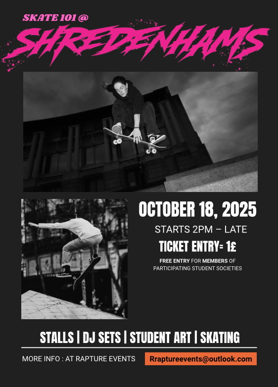 Skate 101 is a celebration of Bristol student talent, bringing together art, music, and skate culture at Shredenhams. In collaboration with UWE societies, the day will feature:
