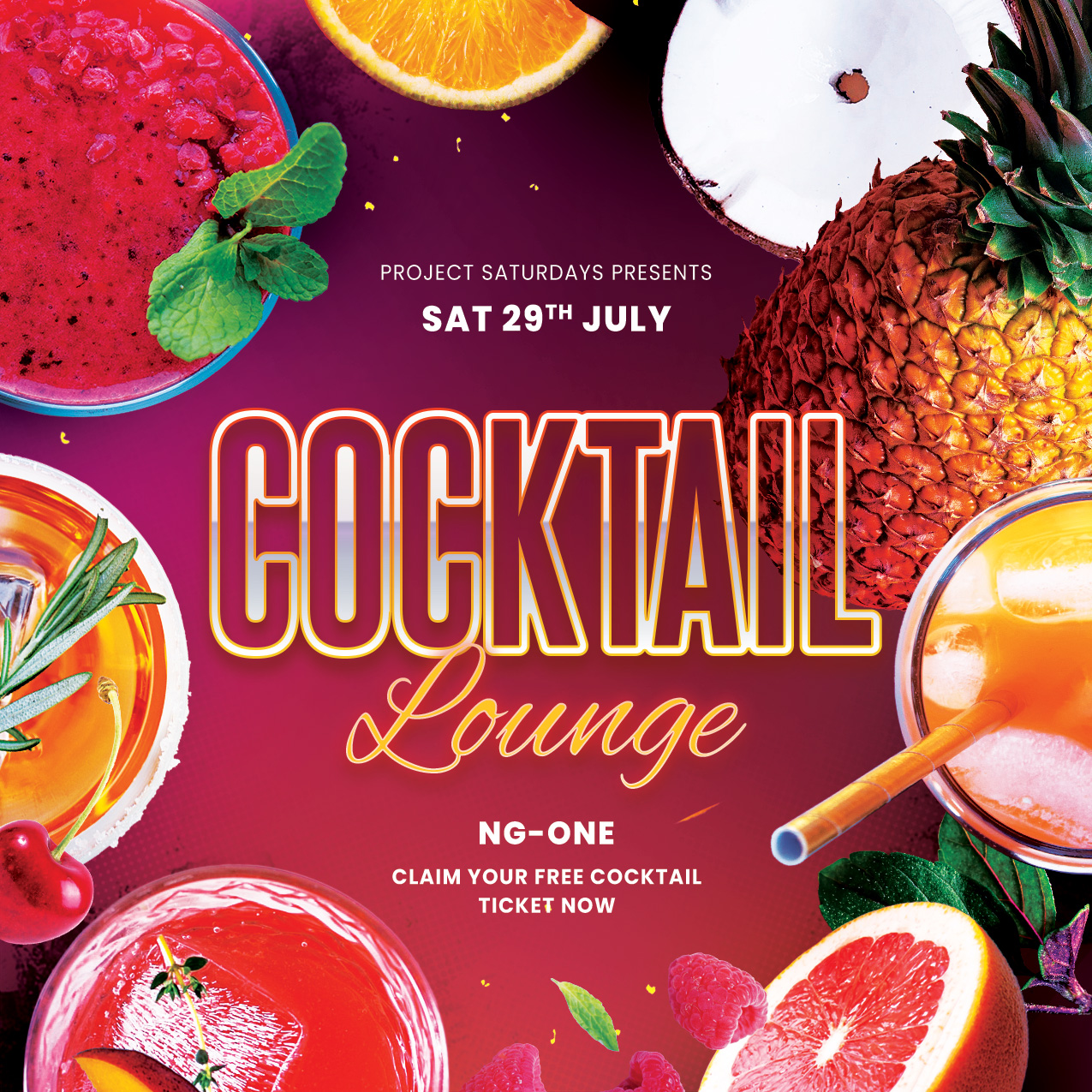 CLAIM YOUR FREE COCKTAIL NOW! ENJOY OUR PROJECT SATURDAYS COCKTAIL LOUNGE TILL 1AM.