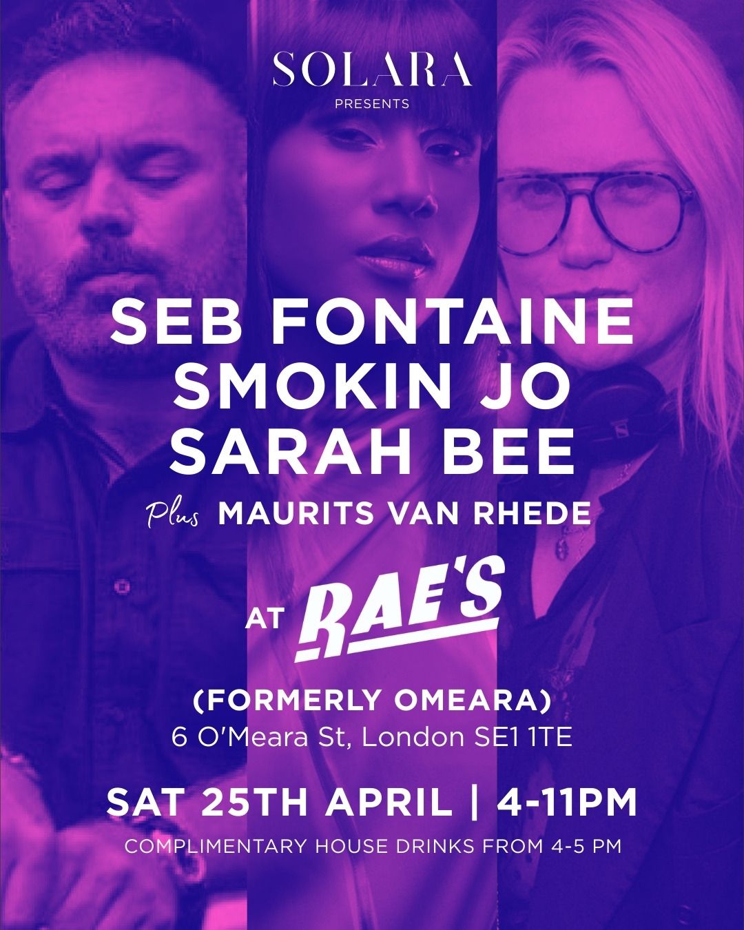 Solara’s over-40’s club event series returns to Rae’s (formerly known as Omeara) for a complete takeover of the club on Saturday 25th April from 4-11pm. Seb Fontaine and Smokin Jo are back as our confirmed headliners, supported by Sarah Bee,, Maurits van Rhede and Morier. As usual the early arrivals will get free house drinks from 4-5pm.