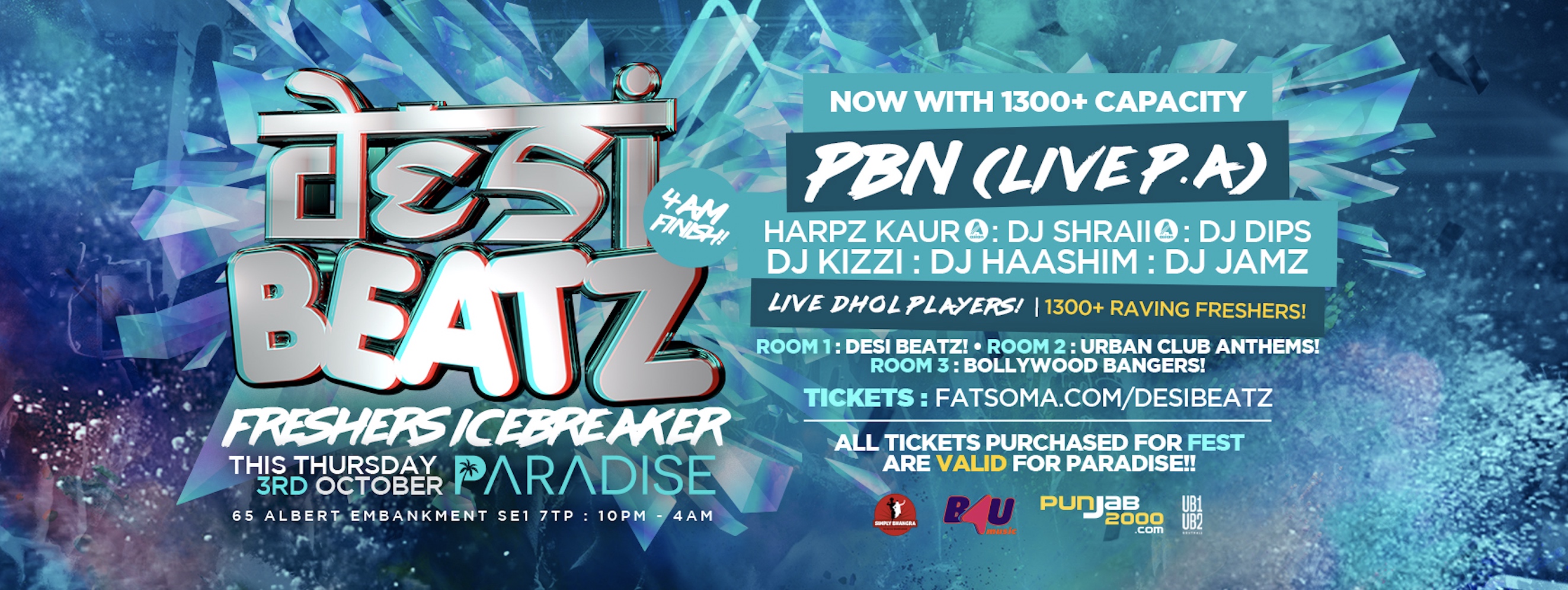 WE’RE BACK! Kicking things off for Freshers 2019 - the first Desi Beatz of the year - the brand you can trust is here with a calendar FULL of blockbuster events!! Our ANNUALLY SOLD OUT ‘Freshers Icebreaker’ event is the largest 7 longest running Desi student mixer party in Europe - 1300+ party animals across 3 Rooms Of Music from over 15 Universities! It’s the perfect way to kick off the new year, whether you are fresher or just want to party like one!!