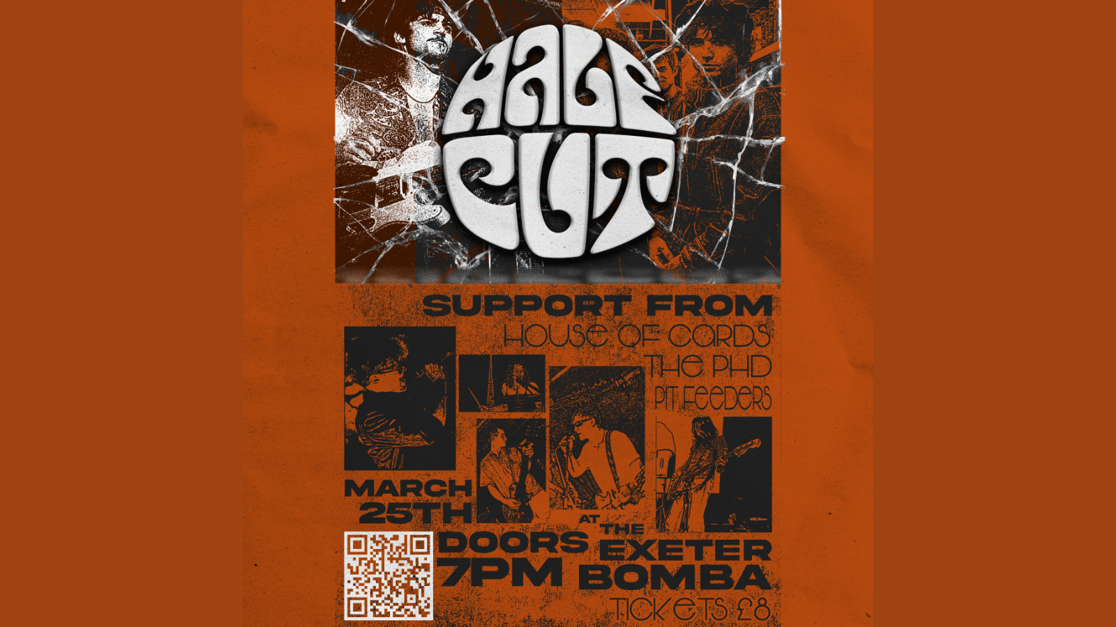 Exeter legends Halfcut will be returning once again to the stage at Bomba on 25th March for the first time in a while and will be joined by House of Cards, The PHD and PitFeeders to make this a hard-hitting lineup not to miss!