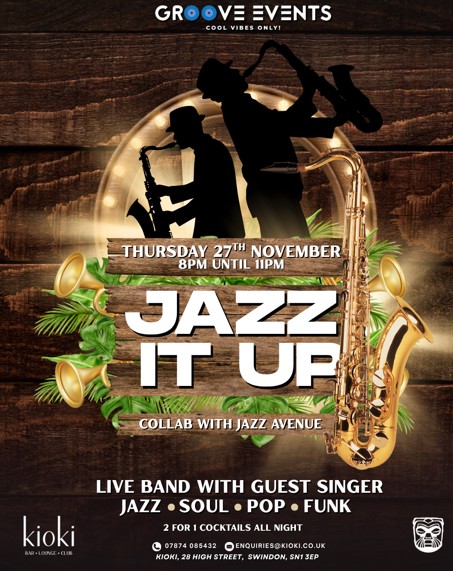 #JazzItUp #LiveJazz #KatieRodgers #JazzAvenueBand #KiokiSwindon #FunkSoulJazz #GrooveEvents #SwindonNights #KiokiCocktailBar #2for1Cocktails #CharcuterieVibes