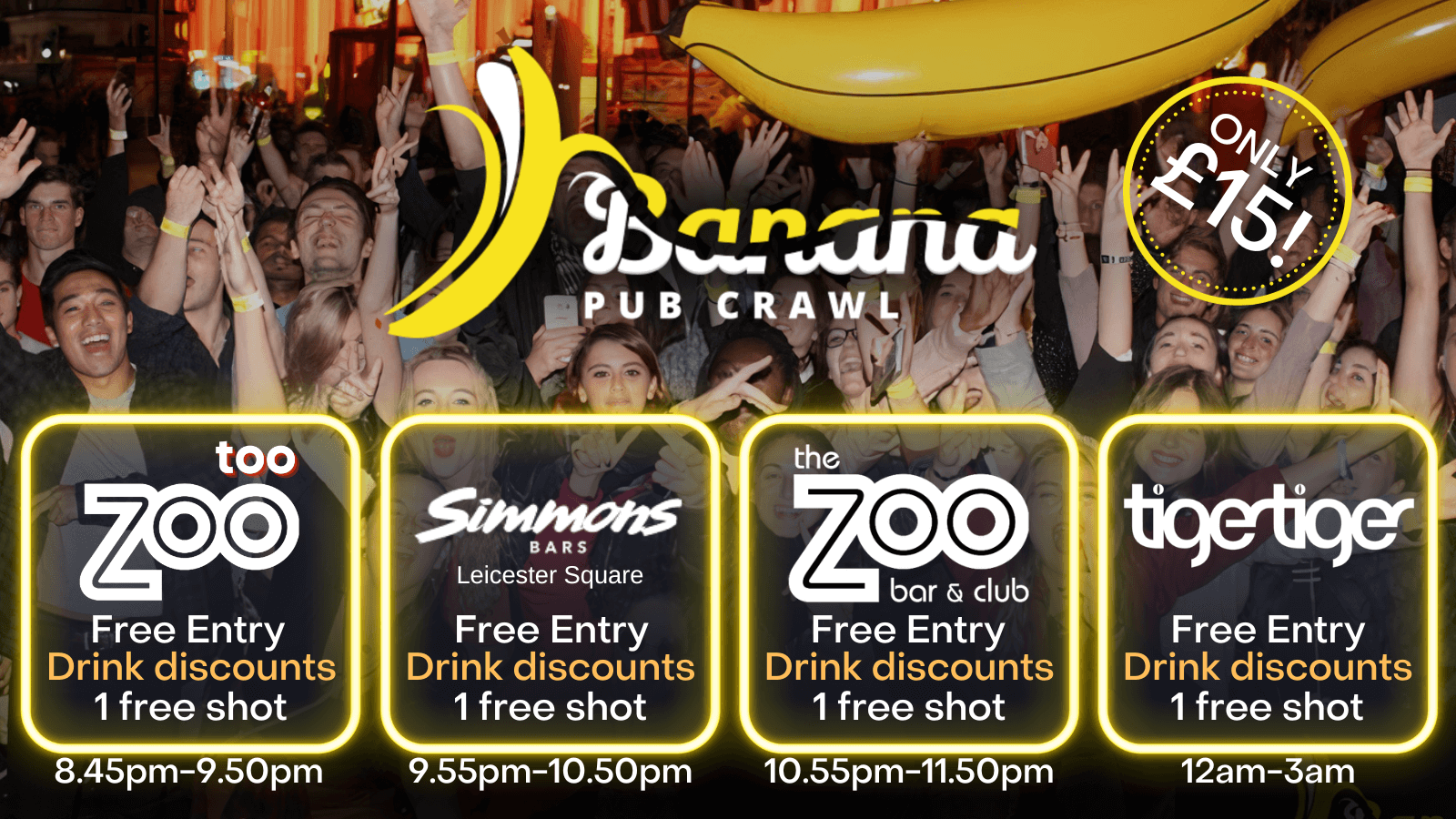ALL ENTRIES INCLUDED + 4 FREE WELCOME SHOTS + HUGE DISCOUNTS ON DRINKS ALL NIGHT THANKS TO OUR BANANA WRISTBAND !