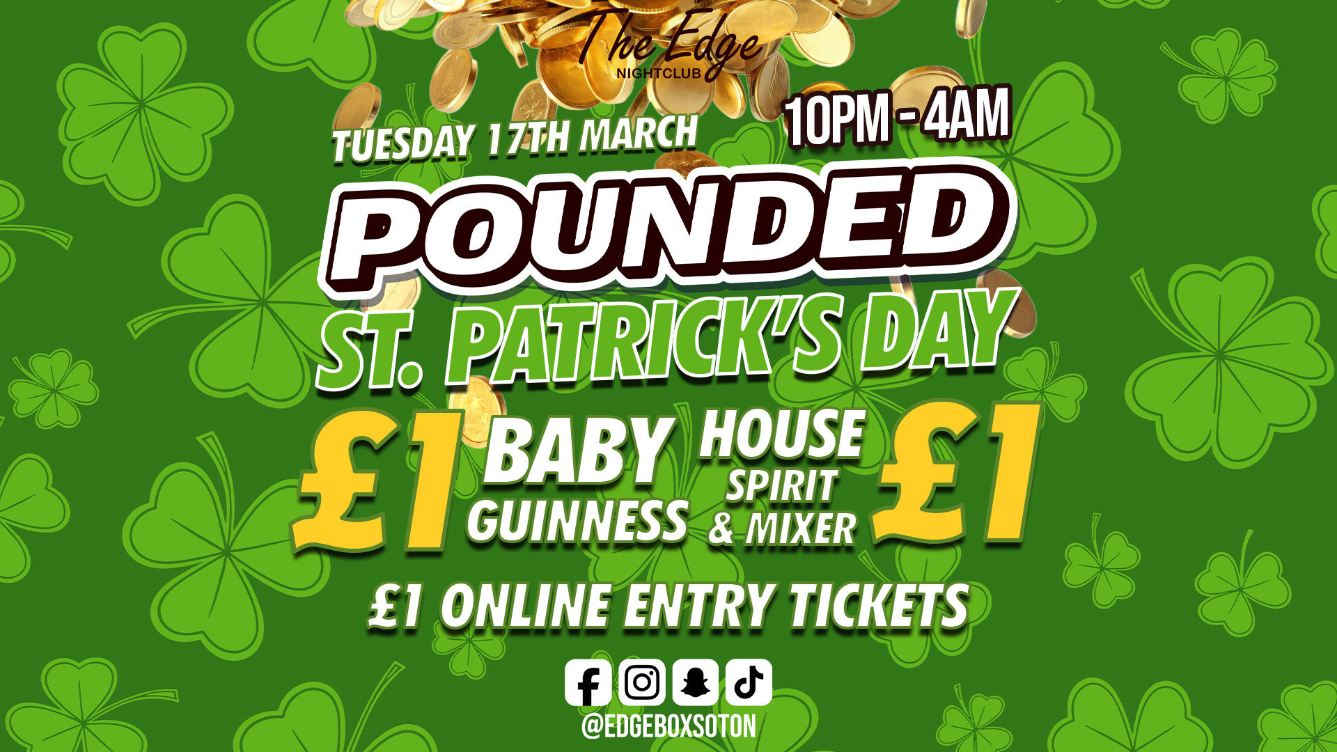 💚Get ready to go green and go hard as POUNDED takes over this St Patrick’s Day for a massive £1 party you don’t want to miss.