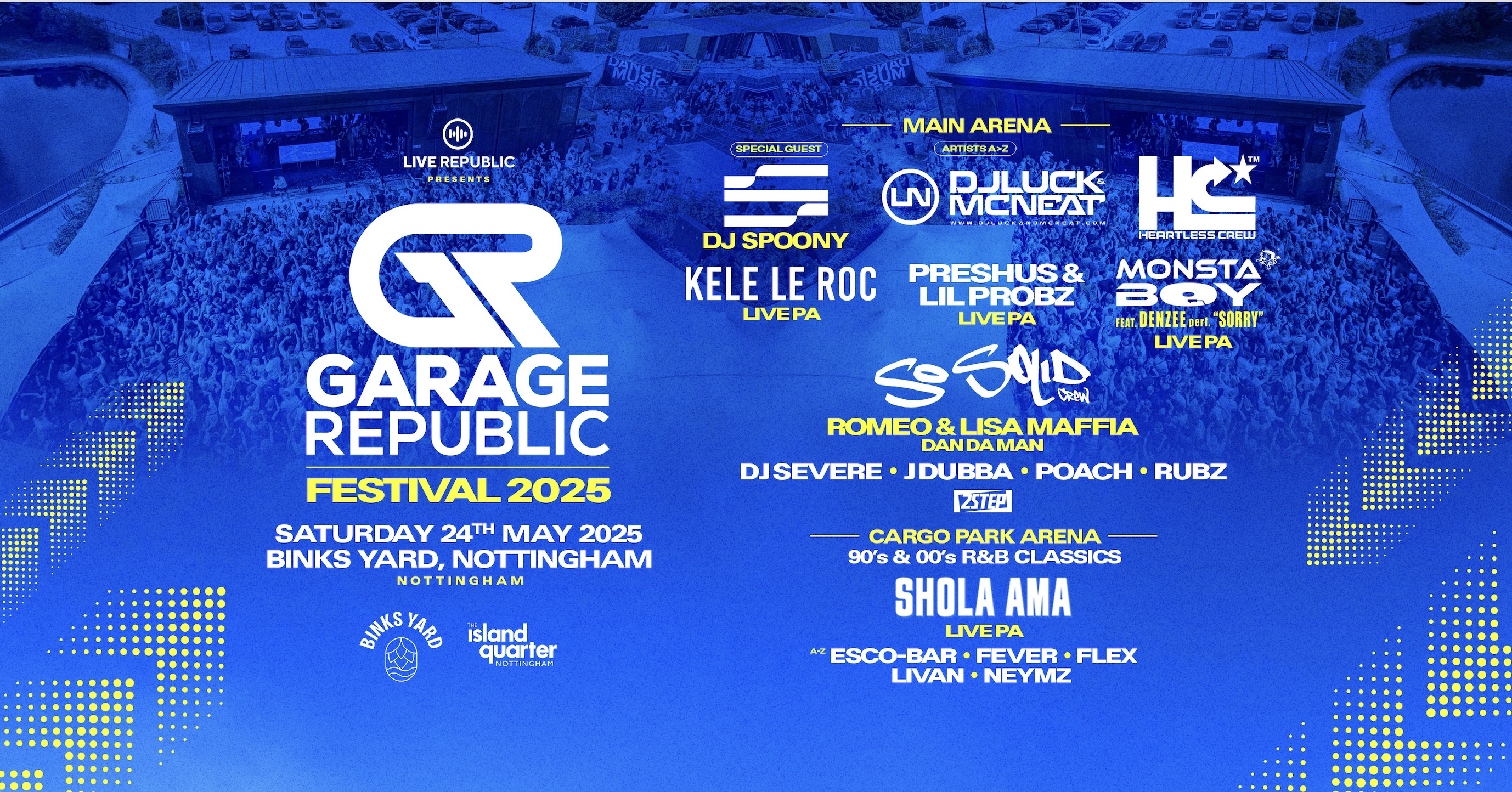 DJ Spoony, DJ Luck & MC Neat, Heartless Crew, Kele Le Roc (Live PA), Preshus & Lil Probz (Live PA), So Solid Crew, Romeo & Lisa Maffia, Shola Ama (Live PA), Monstaboy (Live PA), DJ Severe, Poach, Rubz, Twista plus more join us for our biggest Garage Republic Festival yet at Binks Yard on Saturday 24th May 2025! 🔥