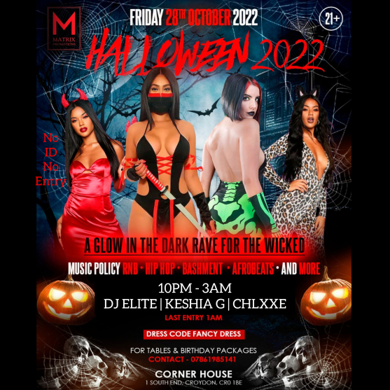 With EVERYONE in fancy dress, the venue TRANSFORMED and some of London's FINEST DJs playing RNB - Hip Hop - Afrobeats - Bashment and more...this Halloween party is set to be a vibe! And WILL SELL OUT!
