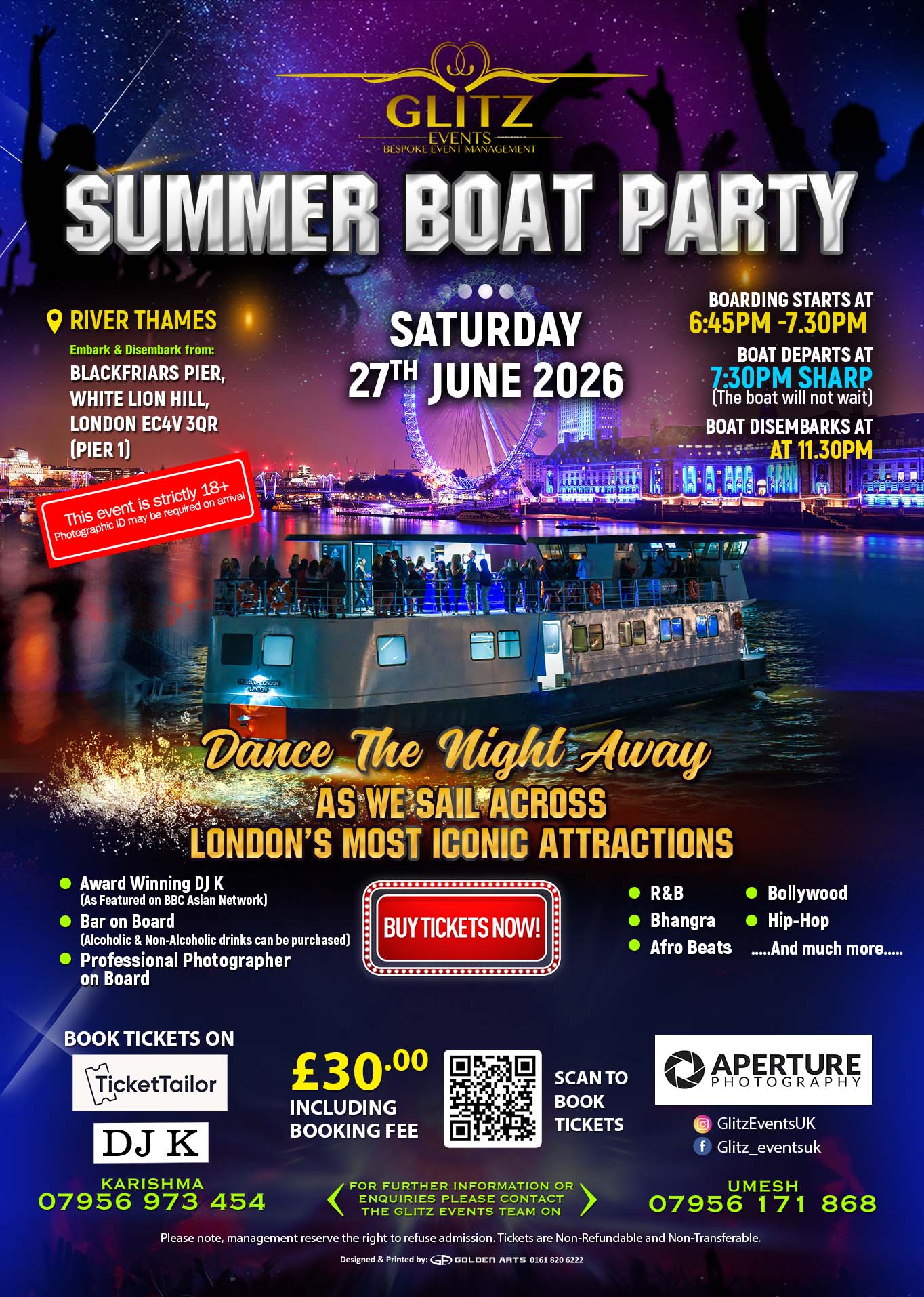 Get ready for an unforgettable night on Saturday, 27th June 2026, as we set sail for a party like no other! Dance the night away with award-winning DJ K (Featured on BBC Asian Network), playing the best in R&B, Bollywood, Hip-Hop, Urban, Bhangra & much more! While our professional photographer captures all your special moments against the stunning London skyline. This event sells out every year! Secure your spot now!