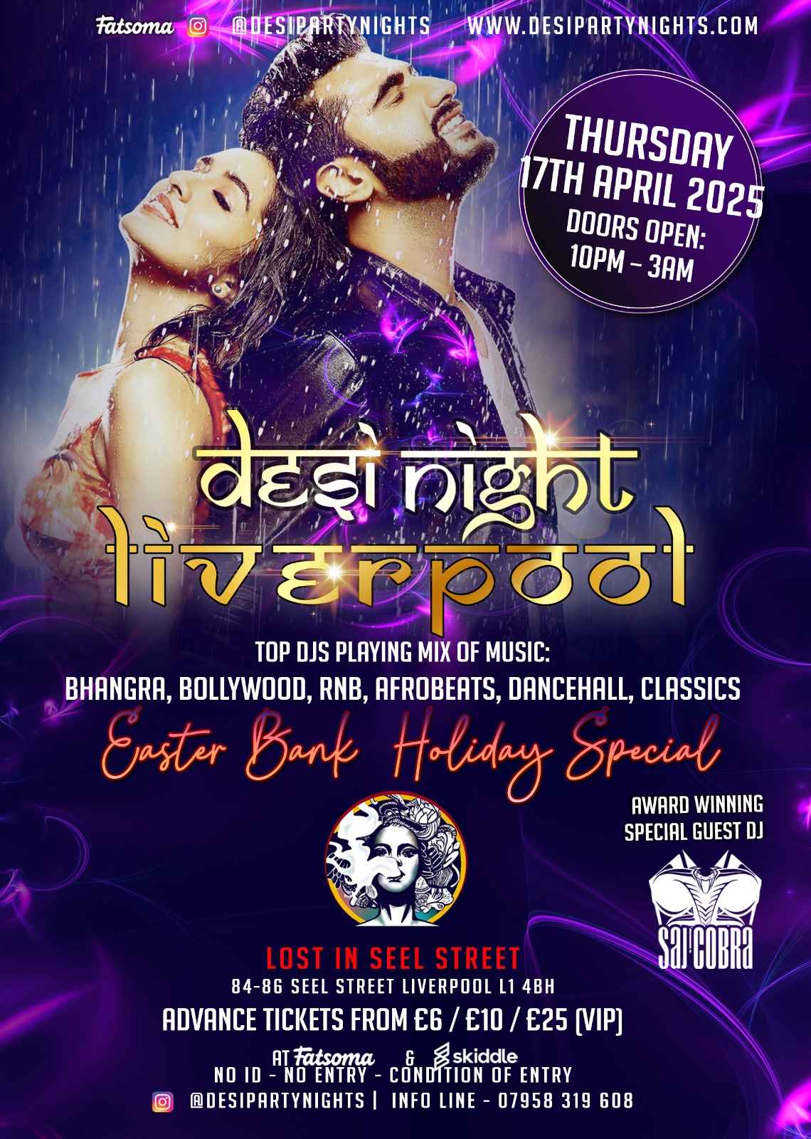 An elegant and upmarket DESI Night in the upmarket brand new venue, LOST IN SEEL STREET, Liverpool. This will be an Easter Weekend special!
