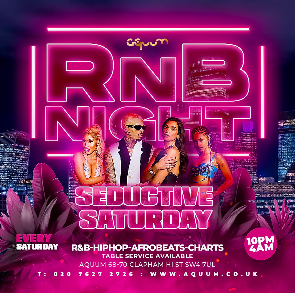 Experience a dazzling Friday night at Aquum, Clapham's premier nightlife destination. The evening starts with the lively vibe of bottomless dinners, setting the stage for a night filled with energy. As the clock strikes 10pm, the atmosphere shifts with DJs taking over, spinning the hottest tracks in commercial R&B and Hip Hop until the early hours of 3:30am. Whether you're there to enjoy the dynamic music, savour the meticulously crafted cocktails, or simply soak in the electrifying ambiance with friends, Aquum promises an unforgettable night out.
