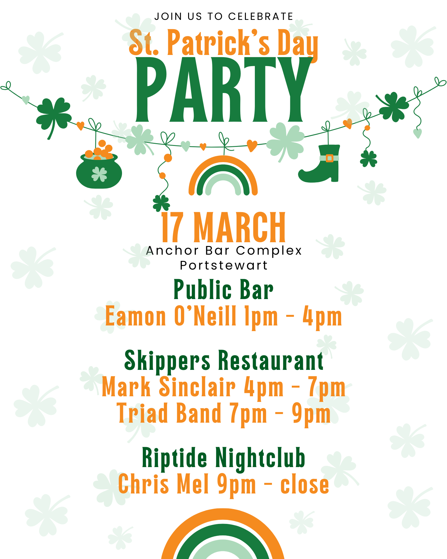 🍀 Get ready for an unforgettable St. Patrick’s Day – 17 March at the Anchor Bar Complex, Portstewart! 🍻🌈