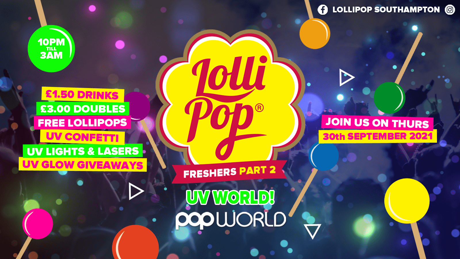 Join us on Thursday 30th September as the Lollipop UV World lands in Southampton for the ultimate explosion of colour with free glow sticks, free glow bracelets, free glow necklaces, UV confetti showers and a club full of people in their tightest and brightest clothing! 🎈