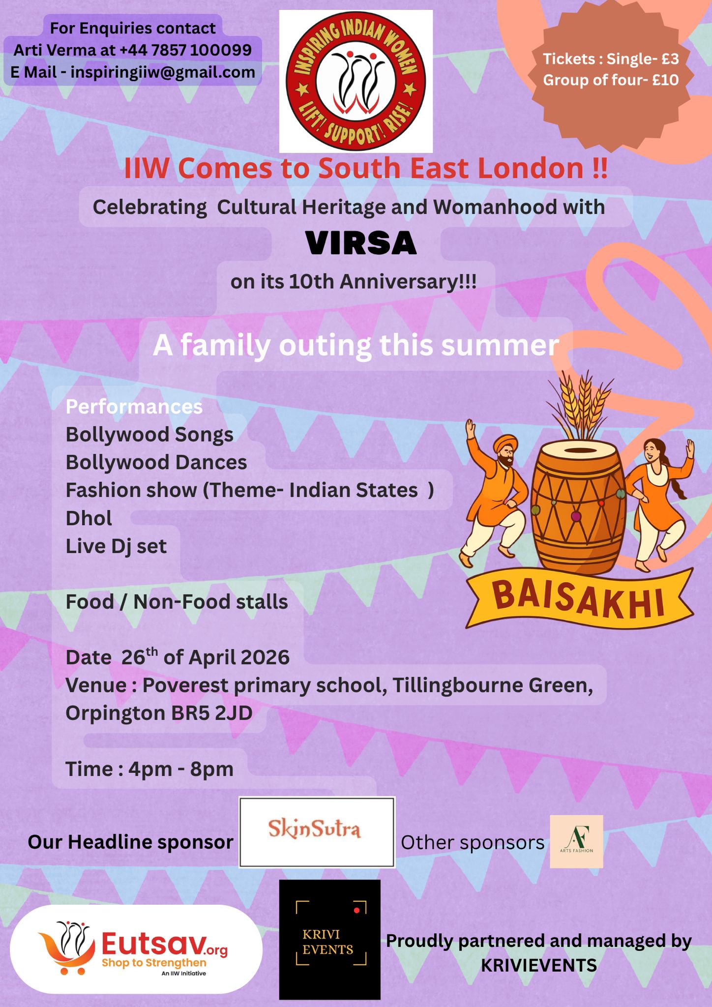 IIW is coming to south east London to celebrate its 10 years anniversary. It will be a fun filled evening with Bollywood songs, Dances based on Bollywood theme, Dhol, Fashion Show and a Bollywood DJ Live set. Not forget, there will be a lot food and non food stalls. The event will highlight on achievements of IIW and celebrate a few unsung impactful women. We look forward to you joining us on 26 April, Sunday at Poverest Primary School, Orpington. 4 pm onwards. Nearest train station - St Mary Cray