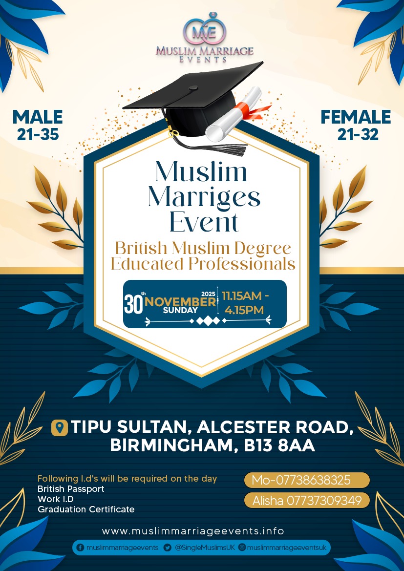 We are holding the next muslim marriage event on Sunday 30th November 2025 at Tipu Sultan, 43 Alcester Road, Moseley, Birmingham, B13 8AA.