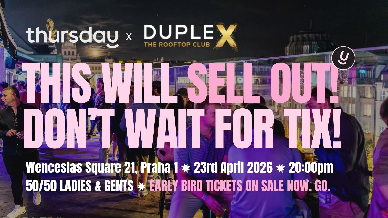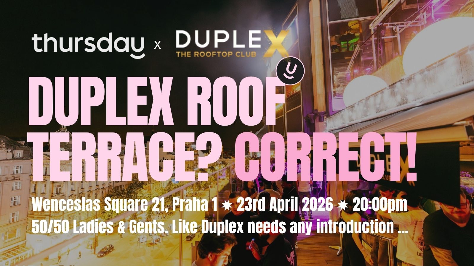 Duplex sits above Wenceslas Square and is one of the most recognised venues in Prague. The roof terrace is not open to the public during our event. Thursday has the whole space, which means everyone there is single and looking to meet people. No couples. No groups who came just to drink. A crowd of singles with a 50/50 ladies and gents split, good music, and full bar service on one of the best rooftops in the city.