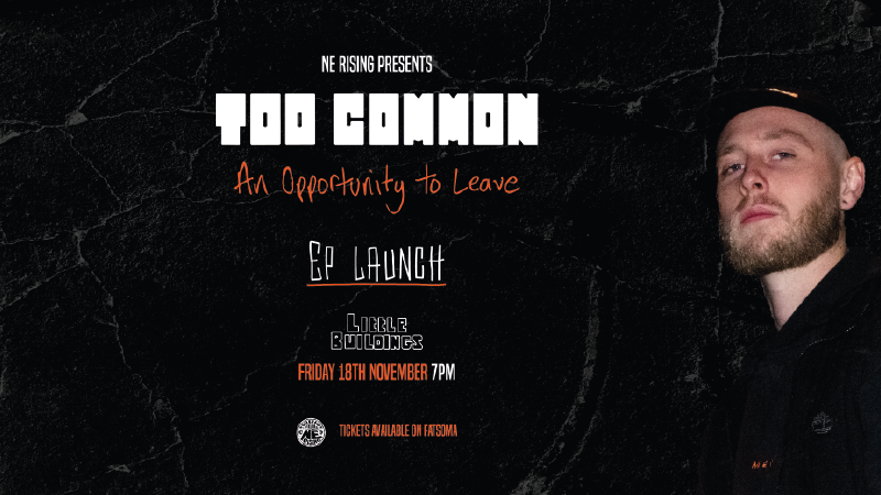 "After 3 years of releasing music, Yorkshire born and bred Too Common announces his latest project with "An Opportunity to Leave" - an 8 track EP featuring by far his best sounding work to date.The adopted Geordie has thrived in recent times, often referred to as one of the best in the local scene after coming up through local open mic events and live shows. This year saw his first festival bookings, where he played at both local festivals, West Ben Fest (Morpeth) and Lindisfarne (Beal Farm).'