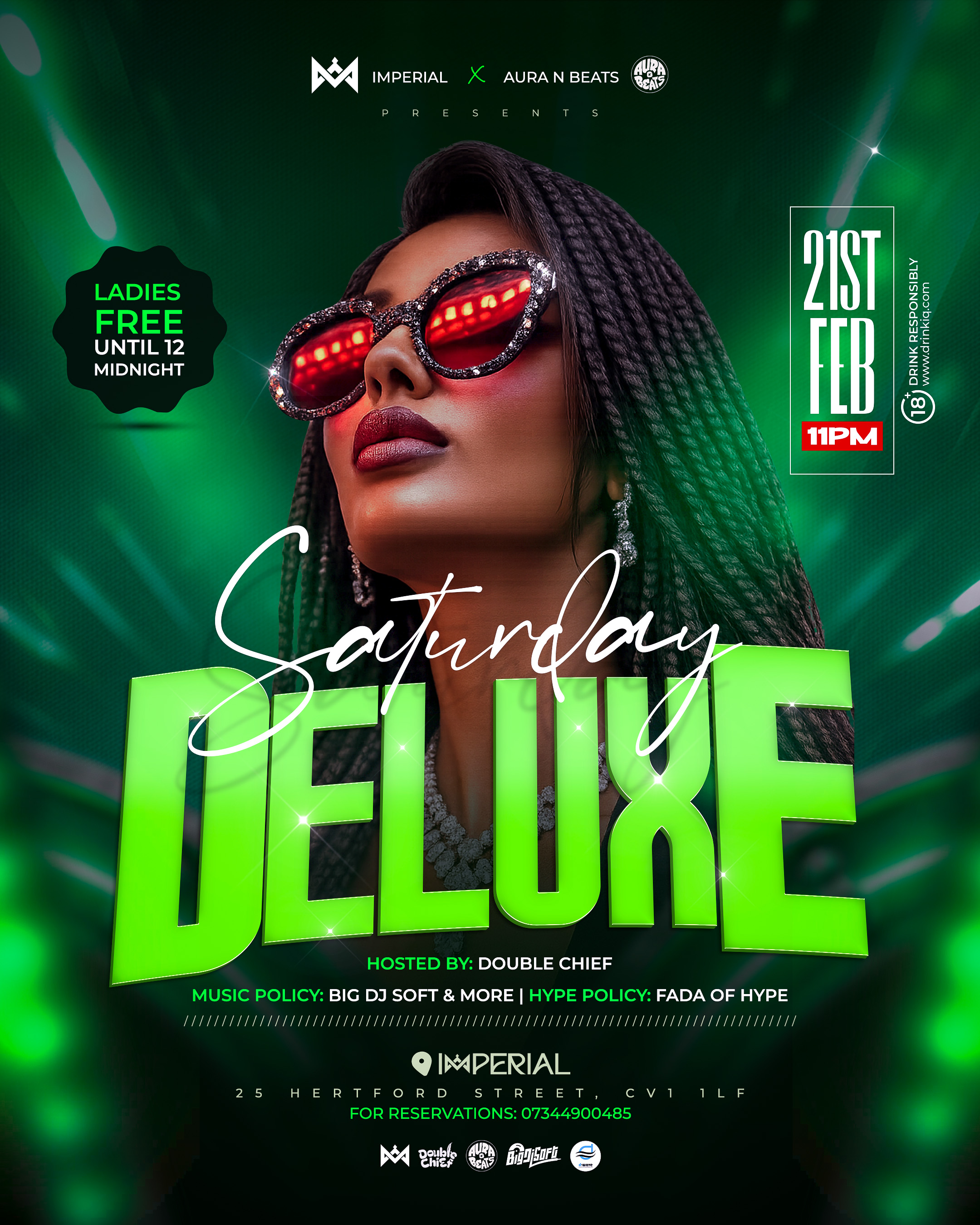 Step into pure luxury and experience Saturday Deluxe — where the city’s finest crowd meets unbeatable music, electric energy, and unforgettable Afro vibes.