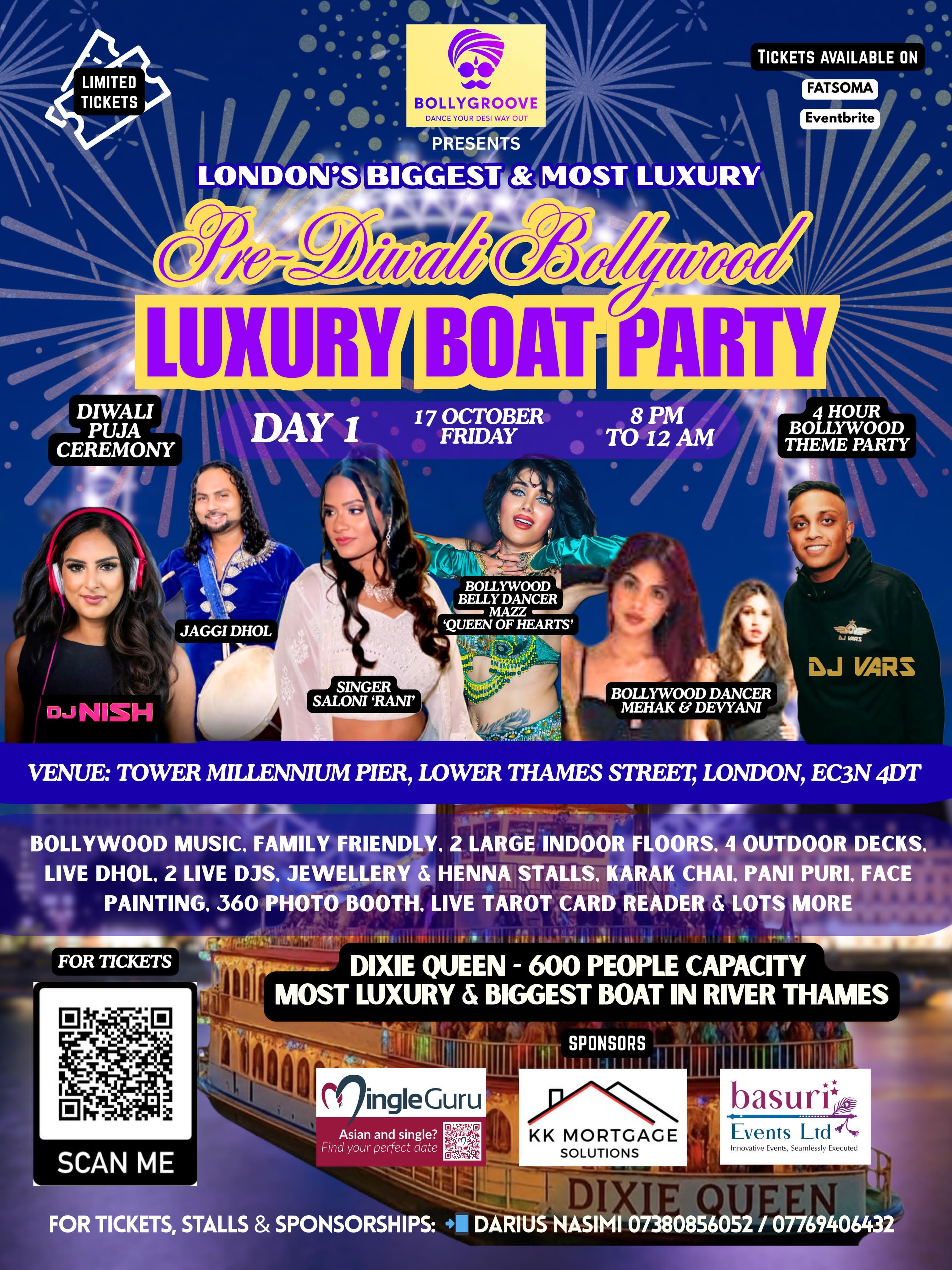 Get ready to illuminate the night sky and set the waters ablaze with LONDON'S BIGGEST & MOST LUXURY BOLLYWOOD PRE-DIWALI BOAT PARTY, an enchanting festival celebration like no other! Join us for an unforgettable evening of vibrant lights, rhythmic beats, and joyous festivities as we sail into the heart of Diwali, the Festival of Lights.