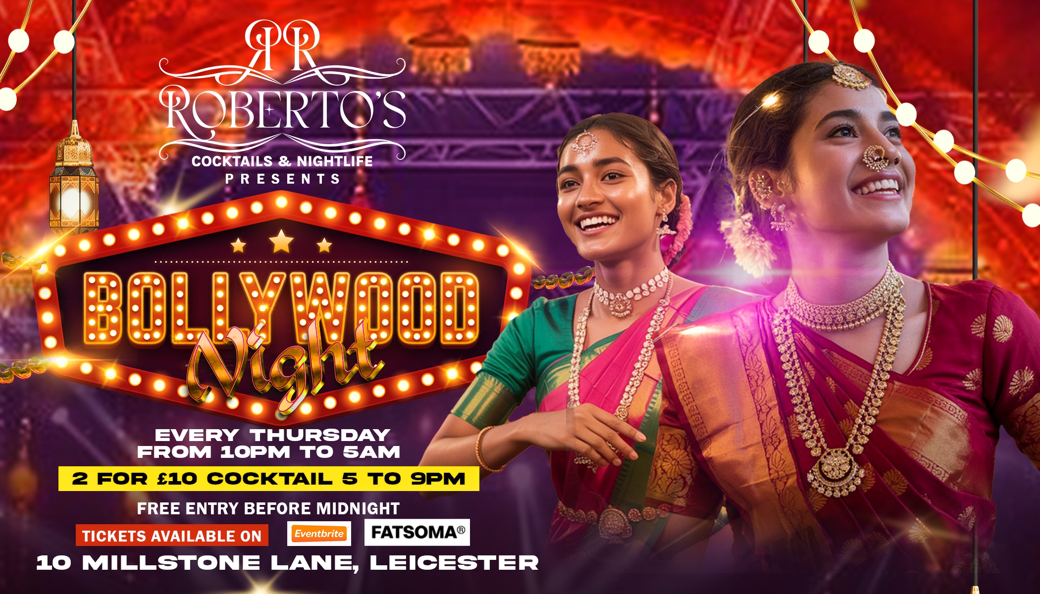 Get ready to light up your Thursdays at Roberto's Cocktails & Nightlife with our sensational Bollywood Night! Join us for a vibrant celebration of music, dance, and culture, featuring the hottest Bollywood tracks, dazzling lights, and a crowd that knows how to party!