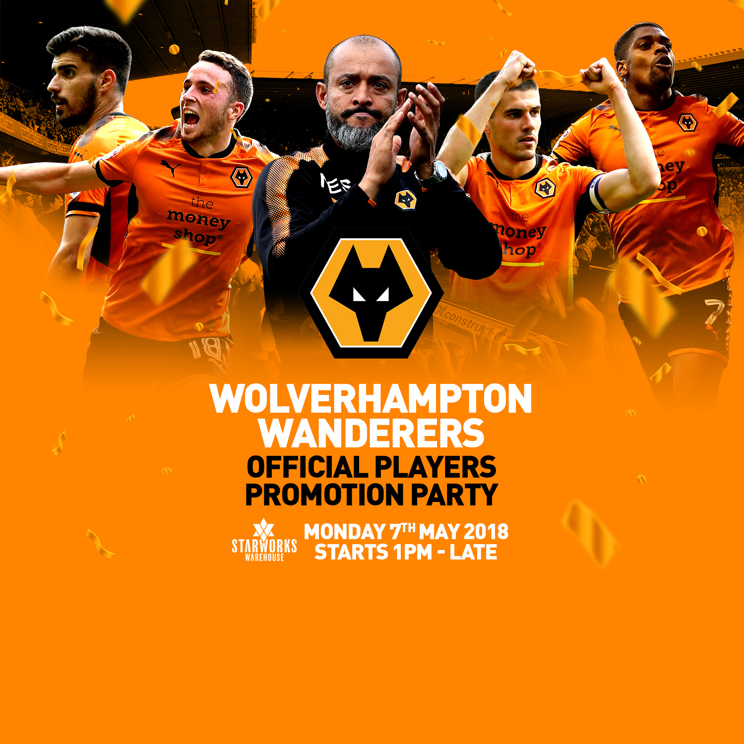 Monday 7th May 2018 Nuno & the Squad will be coming to Starworks to have their own party, celebrating the clubs promotion to the Premiership. Doors open at 1pm where we will have a disco, on our huge screen we will be showing highlights from throughout the season, all the skills, all the goals and of course all of Nuno's amazing celebrations..