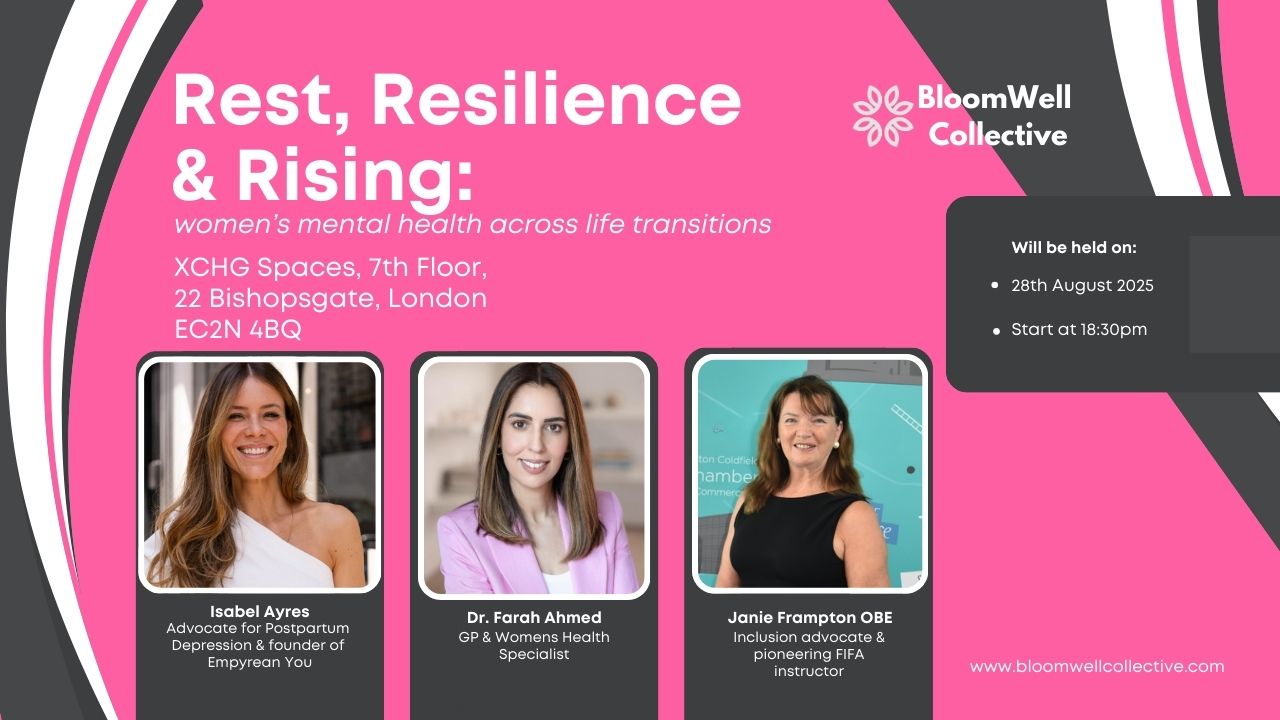 Rest, Resilience & Rising is an evening dedicated to breaking that silence. Hosted by BloomWell Collective, this gathering brings together inspiring women leading in mental health, community care and healing justice. Together, we’ll explore what it means to rest, recover, and rise through life’s transitions and how we can collectively hold space for one another to thrive.