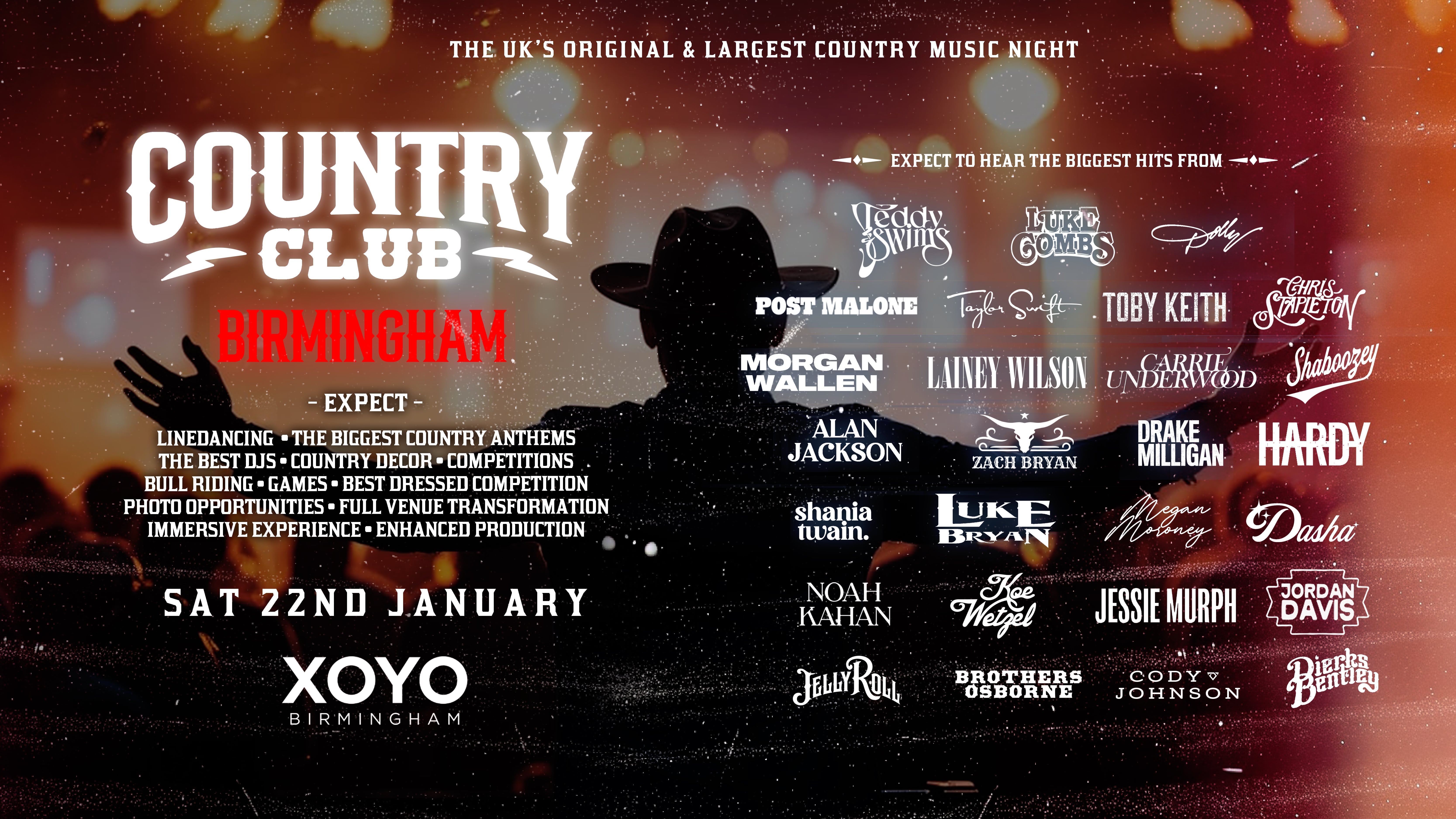 Country Club is taking the UK by storm with a tour like no other! This isn’t just a party—it’s a movement. Get ready for full venue transformations, electric vibes, and a soundtrack that brings together the biggest hits from Luke Combs, Post Malone, Jelly Roll, Morgan Wallen, and Zach Bryan, alongside the iconic sounds of Taylor Swift, Dolly Parton, and Shania Twain. This is the ultimate mix of modern hits and timeless classics, creating a night out you’ll never forget.