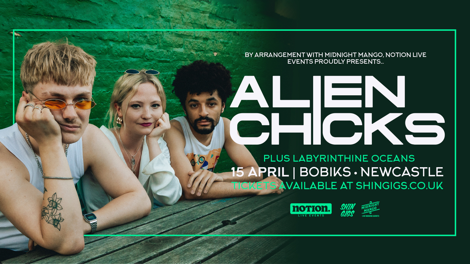 Alien Chicks are a post-punk power trio but their music touches on a whole mix of genres including jazz, rap, and math rock.Their songs are a twisted fairy tale of post-Brexit Britain-a surreal social commentary packed with punchy rhythms, eclectic time signatures and nostalgic harmonies. Their youthful charisma, humour, passion, and sense of fun make for an addictively energetic live show.