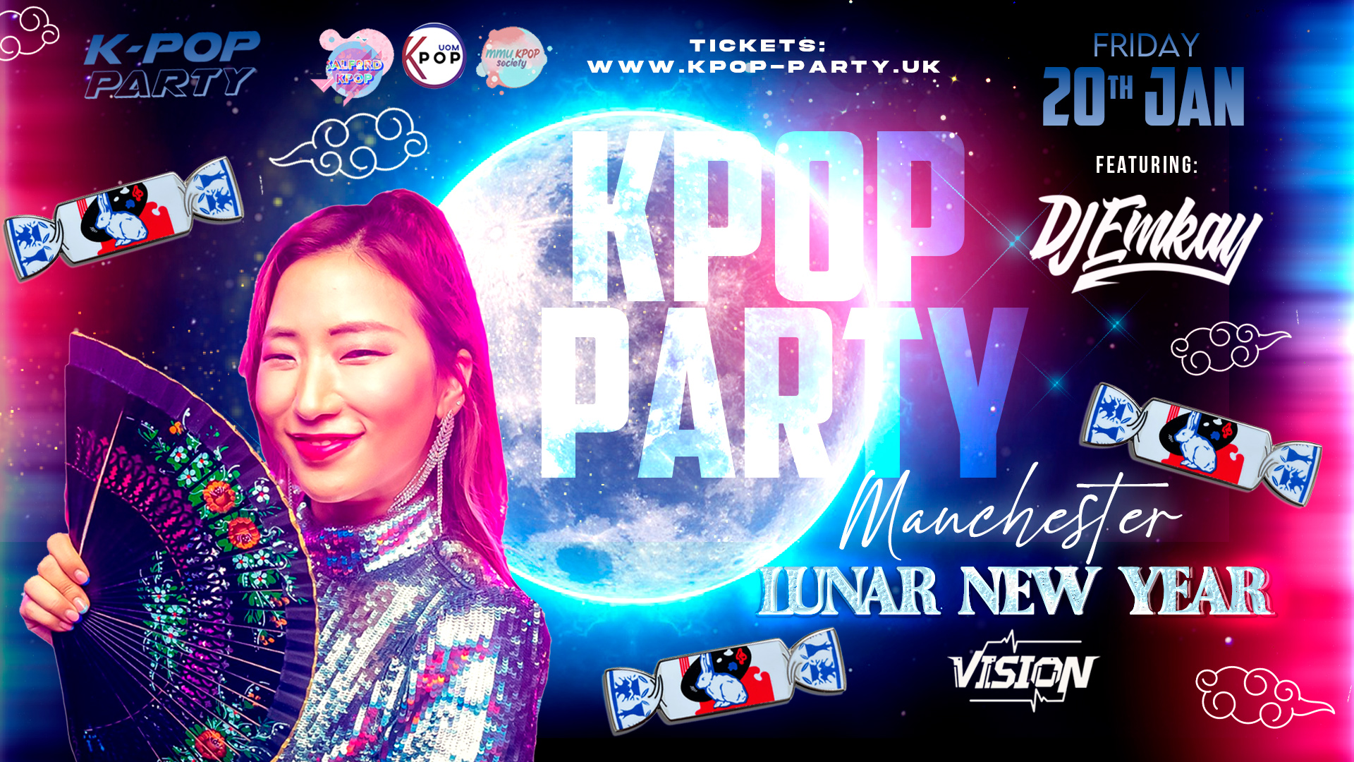 We welcome 2023 celebrating and inviting you all back for another edition of K-Pop Party UK. This time we bring the LUNAR NEW YEAR KPOP PARTY with DJ EMKAY!! We coming to Manchester!! WE takeover the downstairs club room at Vision Nightclub!