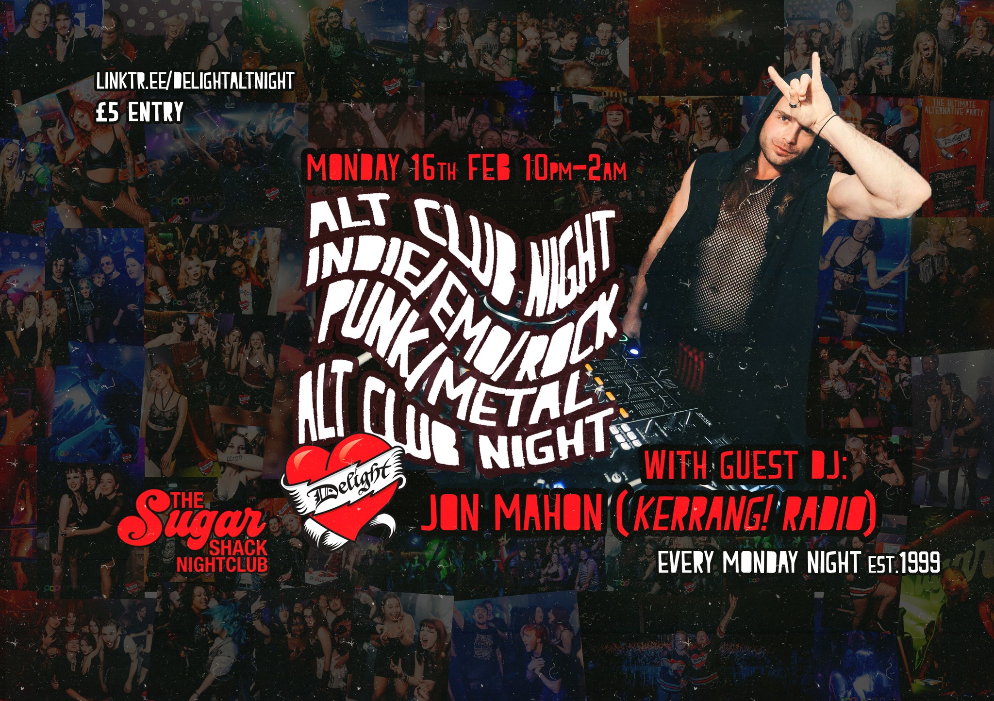 Jon hosts Kerrang! Radio daily (10am–1pm), is a former Skuzz TV legend, a festival-hardened selector, and a regular destroyer of the world’s best alternative dancefloors. Every time he touches Delight it turns feral — expect wall-to-wall alt anthems, zero filler, and absolute scenes. We’re buzzing to have him back where he belongs.