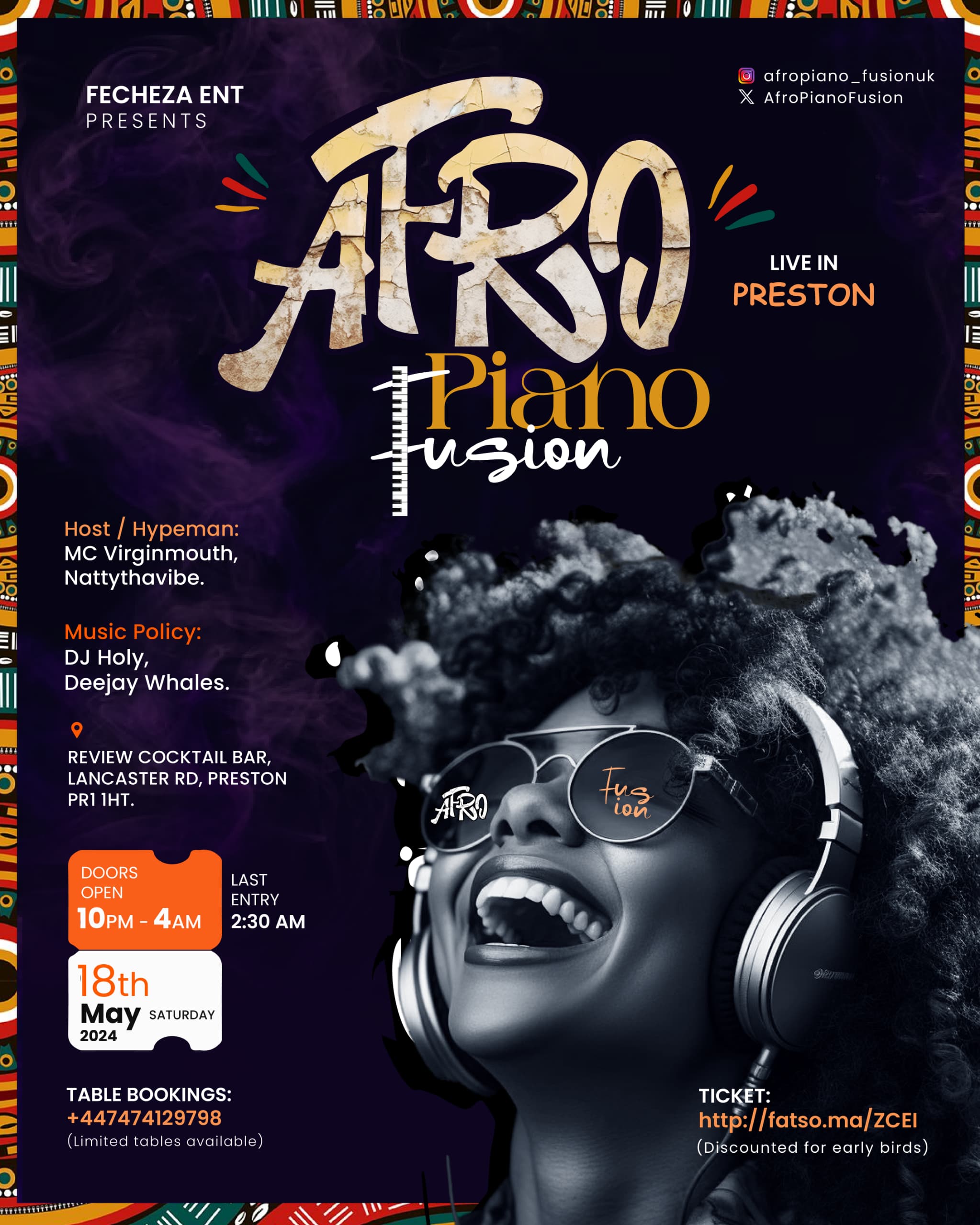 Welcome to the ultimate fusion rave! Join us for an electrifying extravaganza where international DJs and MCs collide, igniting the dance floor with the irresistible rhythms of Afrobeats and Amapiano. Get ready to groove like never before as Preston comes alive with the vibrant beats and pulsating energy of Afropiano fusion. You're invited to unleash your inner rhythm and be part of an unforgettable musical experience.