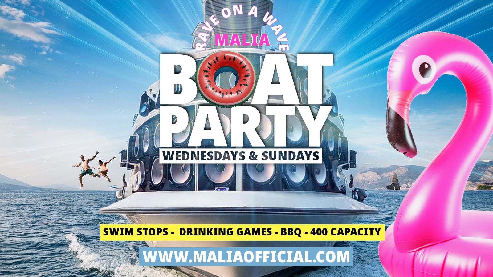 It's the RAVE ON A WAVE MALIA BOAT PARTY !!! Spend the day on the seas on the best booze cruise on the island, expect fun and games and plenty of alcohol along the beautiful bays along the Mediterranean coast. Prepare to down shots, dance all and swim in the crystal blue seas. With DJ's banging the music all day this is one of Malia's best boat parties to be on. Trip includes transportation and free BBQ
