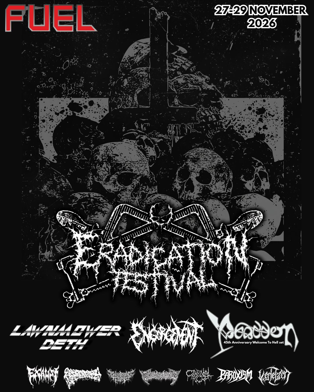 Wales' premier extreme metal event Eradication Festival returns to Fuel Rock Club, Cardiff 27th-29th November 2026. Grab your tickets to Wales' longest running underground heavy metal festival. Death metal, black metal, thrash metal, grindcore & beyond.