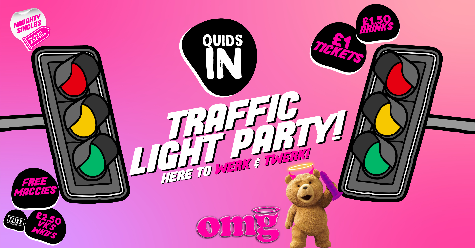 Hold on to your wigs and get ready to cruise the lanes because Quids In is taking you on a wild ride this Monday at OMG! 🚗💨 It’s the Traffic Light Naughty Singles Party, and honey, things are about to get steamy!