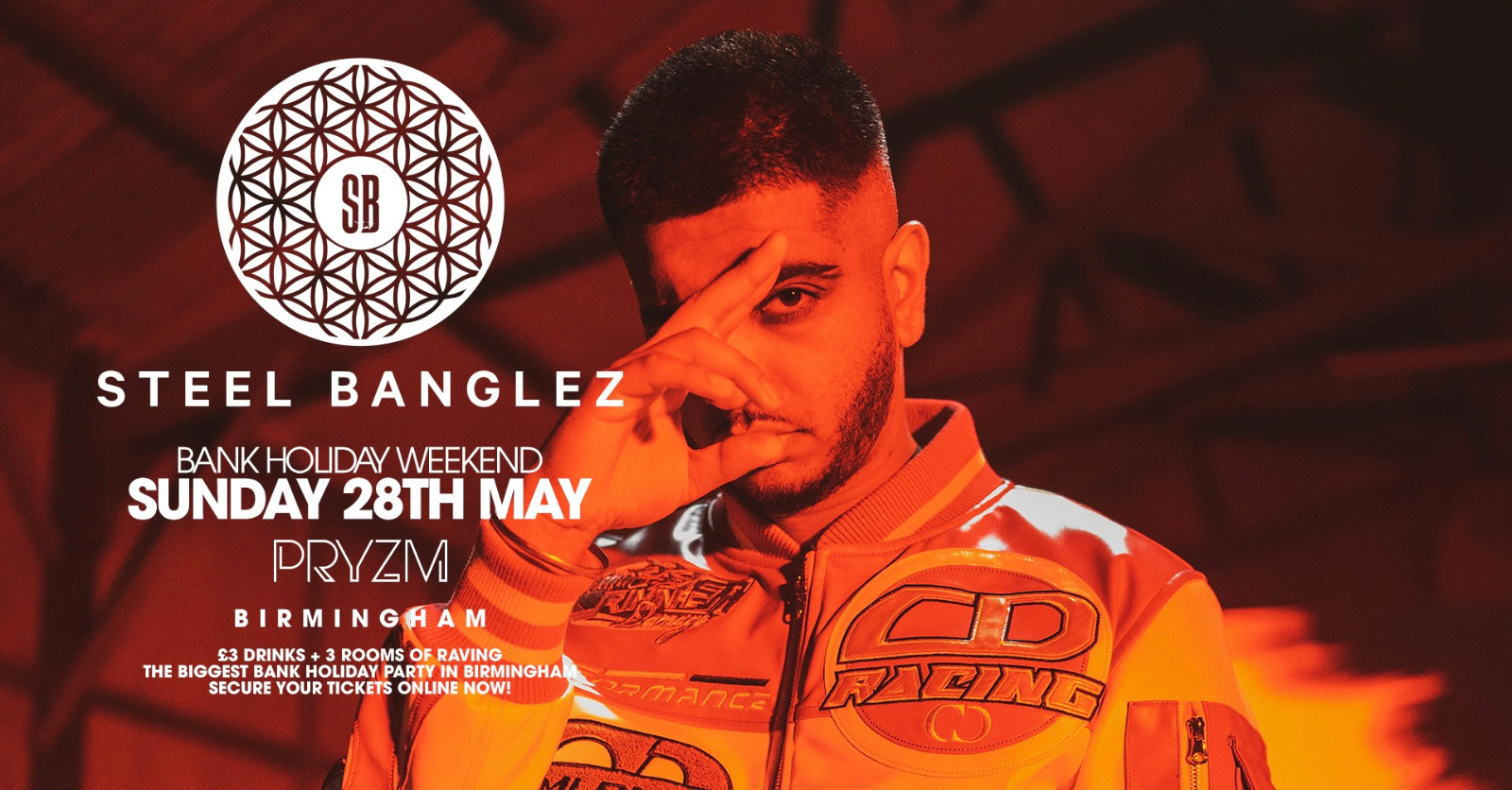 Yes we're gassed to announce the BIGGEST Bank Holiday Event of this month, as we bring Top 10 Hit Maker STEEL BANGLEZ to PRYZM Birmingham for his only Birmingham event this Summer.