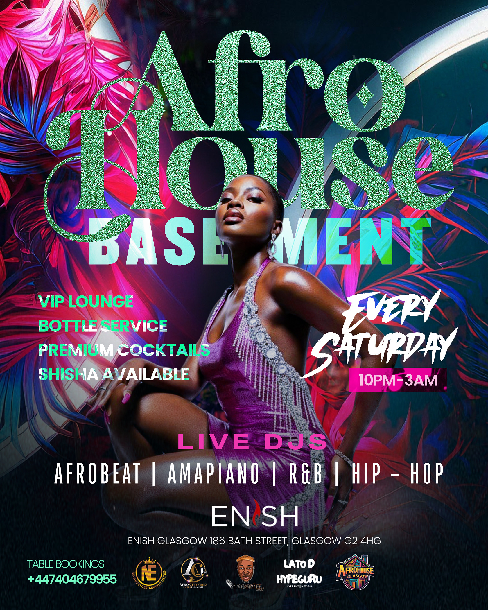 Every Saturday night we bring the city together at Enish Glasgow, delivering the best sounds of Afrobeats, Amapiano, Dancehall & Hip Hop. With DJs, MCs, live performers, and an electric crowd, AfroHouse is the heartbeat of Glasgow’s nightlife. 🖤