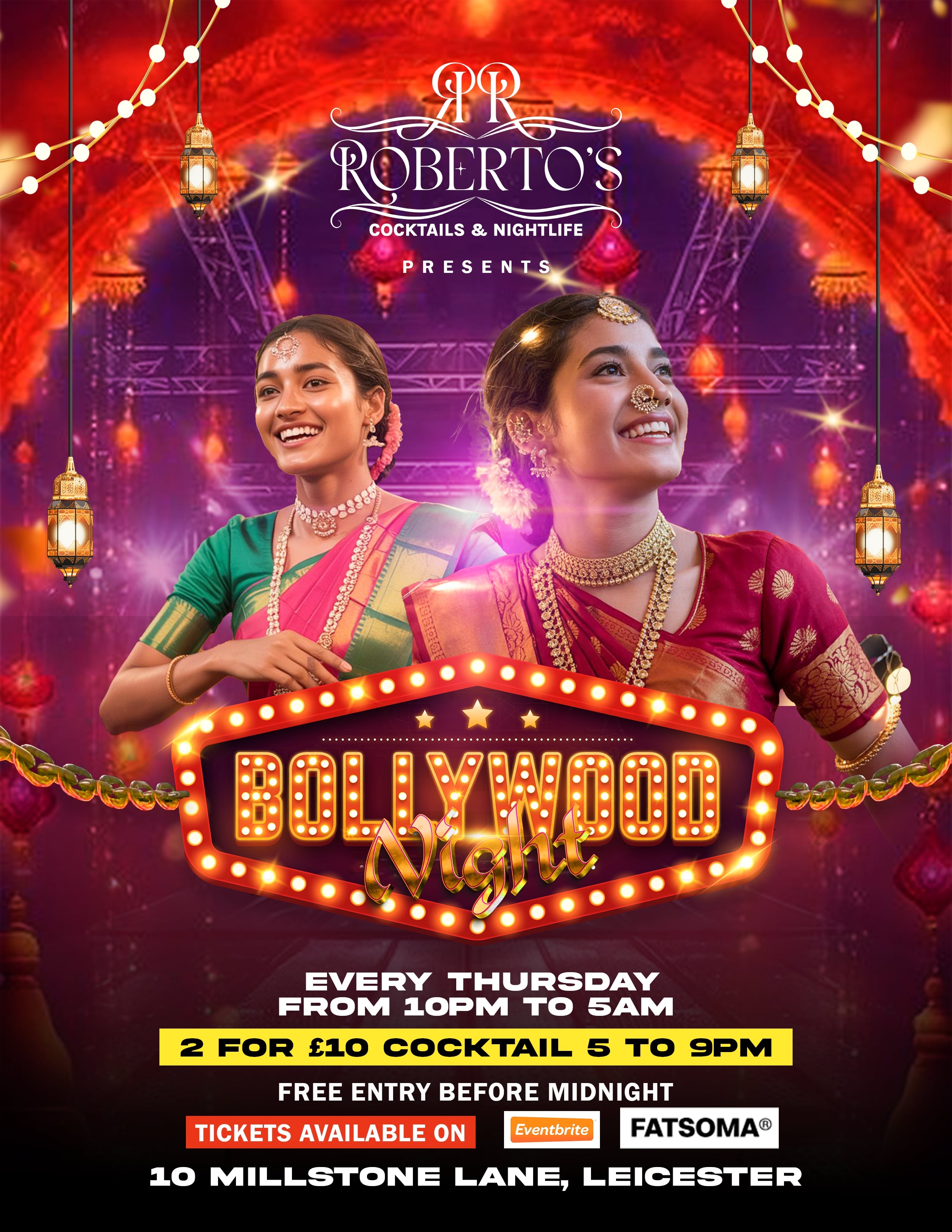 Step into the spotlight and experience Leicester’s most electrifying celebration of South Asian culture – Bollywood Night at Roberto’s Bar! Nestled in the heart of the city, Roberto’s transforms into a dazzling haven of music, color, and cinematic magic every week.