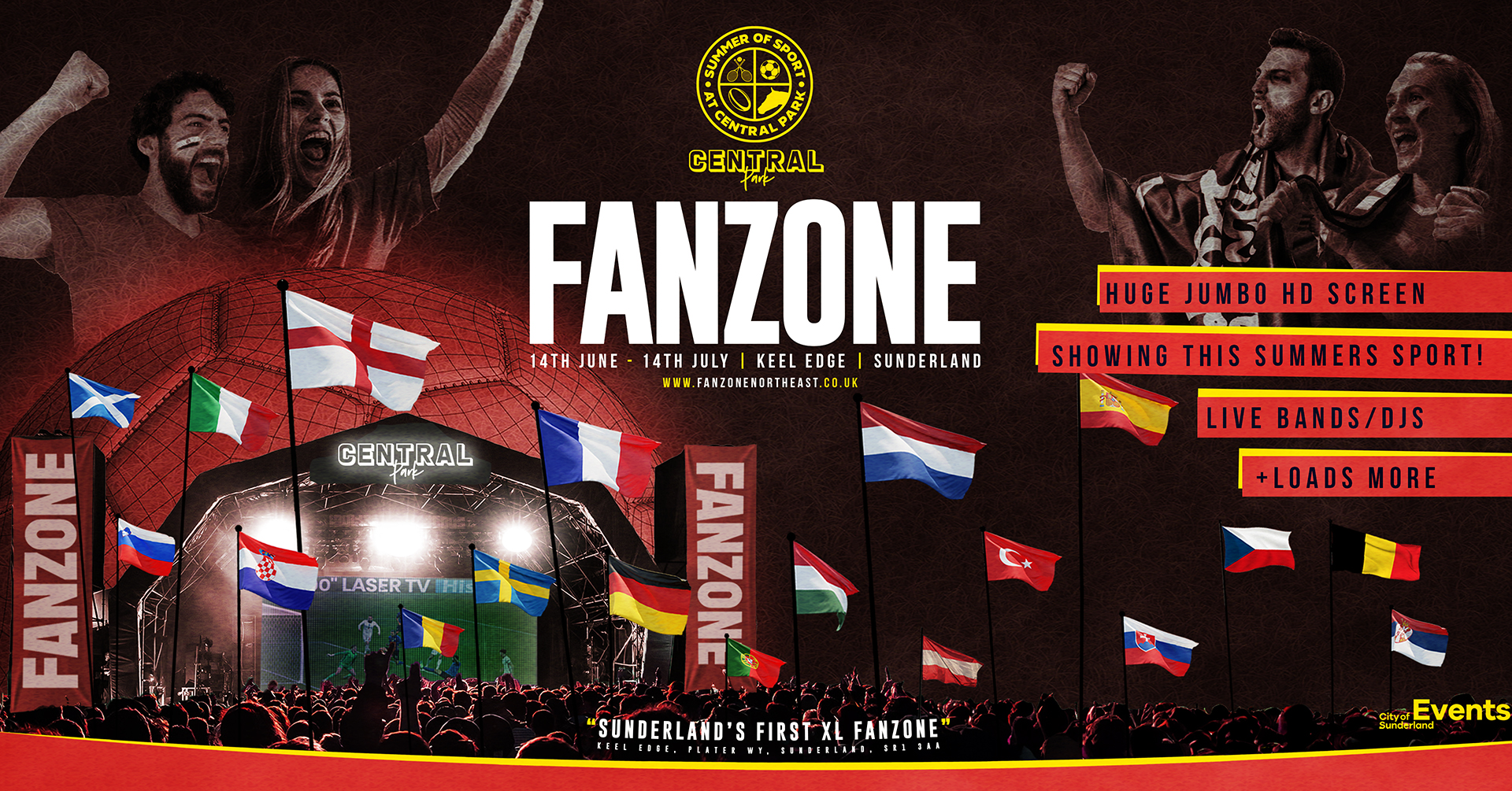 The region’s number one sports fanzone, you know and love, Central Park' is expanding to Keel Edge, Sunderland this "Summer of Sport" for the amazing spectacle of football, Tennis & Sport from across Europe! Together with our new partnership with Lucozade, we are buzzing to be bringing the electrifying, big crowd, atmosphere fanzone to the city this June, showing all the England, Scotland and all the games this June!