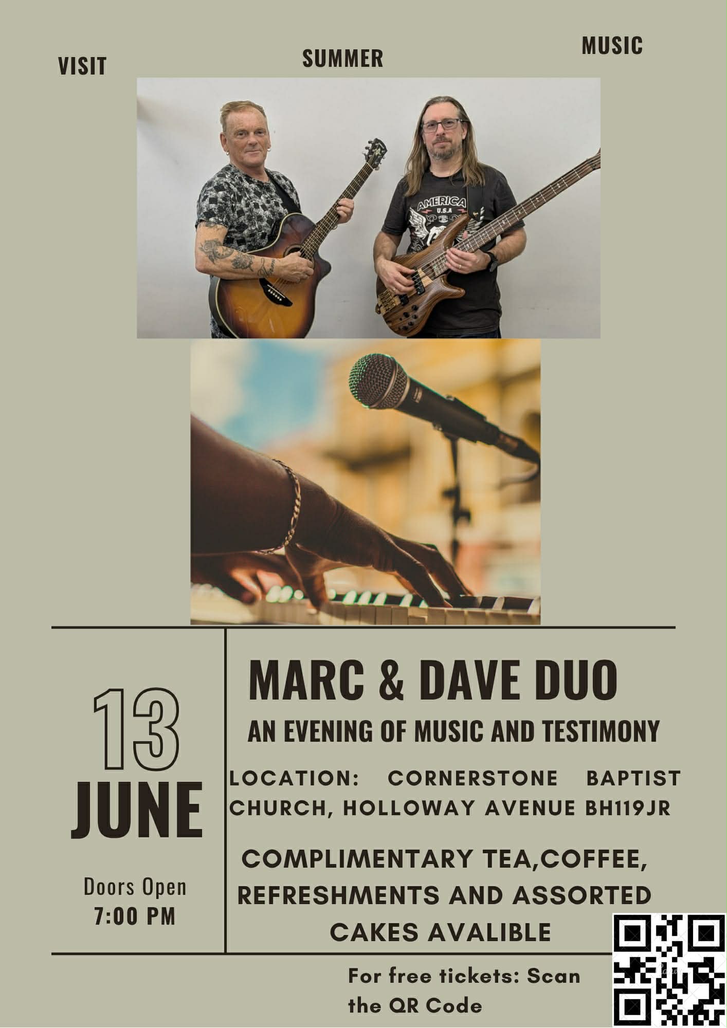 Mark & Dave A unique duo sharing powerful testimonies and heartfelt original music. Experience an evening of authentic stories and soulful sounds straight from the heart.